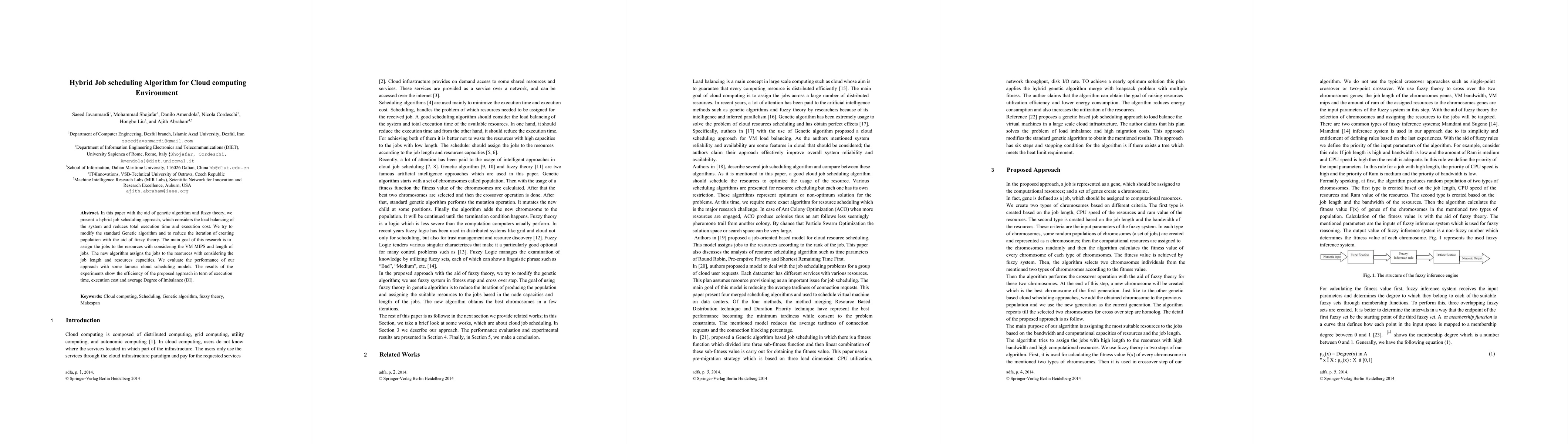 In this paper with the aid of genetic algorithm and fuzzy theory, we present a hybrid job scheduling approach, which considers the load balancing of the system and reduces total execution time and execution cost. We try to modify the standard Genetic algorithm and to reduce the iteration of creating population with the aid of fuzzy theory. The main goal of this research is to assign the jobs to the resources with considering the VM MIPS and length of jobs. The new algorithm assigns the jobs to the resources with considering the job length and resources capacities. We evaluate the performance of our approach with some famous cloud scheduling models. The results of the experiments show the efficiency of the proposed approach in term of execution time, execution cost and average Degree of Imbalance (DI).