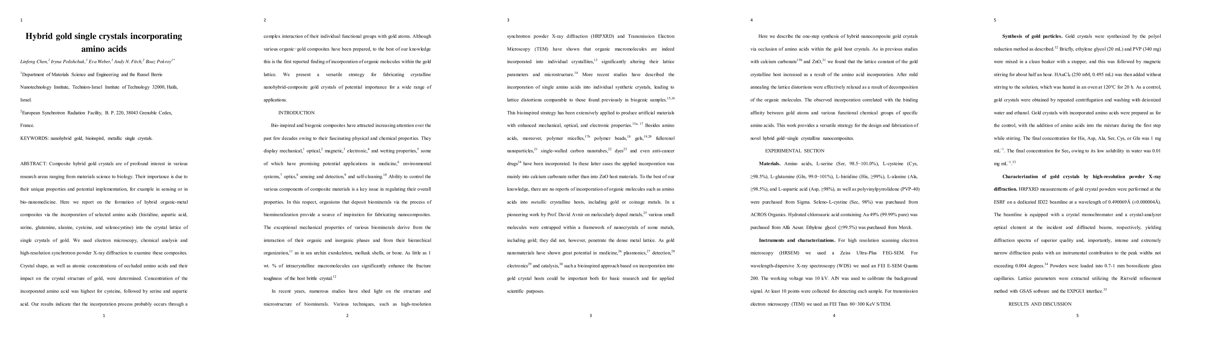 This paper reports the formation of hybrid gold single crystals incorporating various amino acids, using electron microscopy and X-ray diffraction to analyze the composites. The study finds that cysteine, serine, and aspartic acid have the highest incorporation rates, suggesting complex interactions with gold atoms, marking the first documented inclusion of organic molecules within a gold lattice.