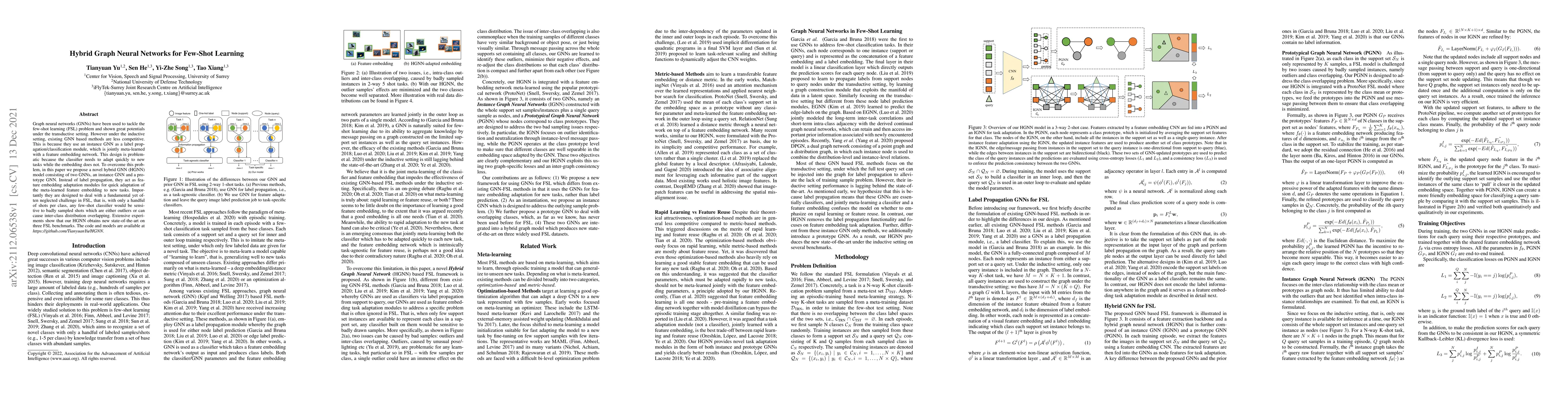 This paper proposes a hybrid graph neural network (HGNN) model with two GNNs—an instance GNN and a prototype GNN—to improve few-shot learning (FSL) performance under the inductive setting. The HGNN addresses the challenge of poorly sampled few-shot data by quickly adapting the meta-learned feature embedding to new tasks, achieving state-of-the-art results on three FSL benchmarks.