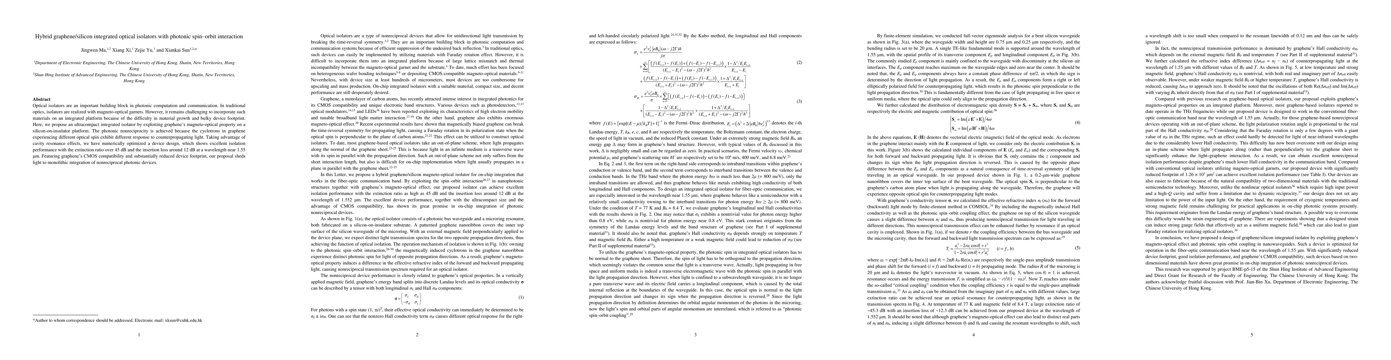 This paper proposes an ultracompact integrated optical isolator using hybrid graphene/silicon technology, leveraging graphene's magneto-optical properties for photonic nonreciprocity. The design achieves high isolation performance with an extinction ratio over 45 dB and minimal insertion loss, offering a promising solution for photonic computation and communication.