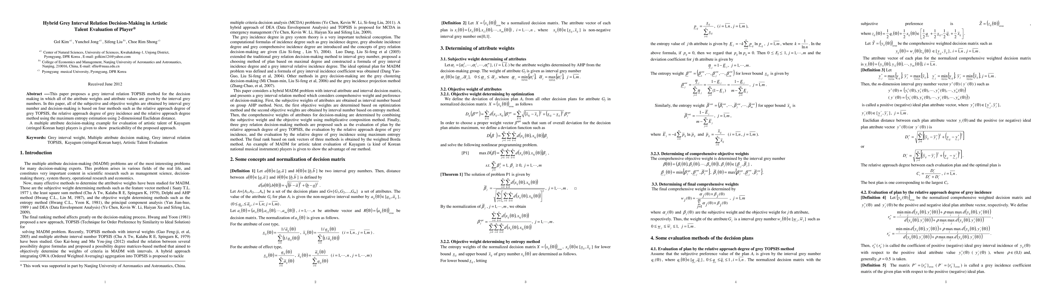 This paper introduces a grey interval relation TOPSIS method for evaluating artistic talent in Kayagum players, using interval grey numbers for attribute weights and values. The evaluation employs four decision-making approaches, demonstrating the method's practicality through a multiple attribute decision-making example.