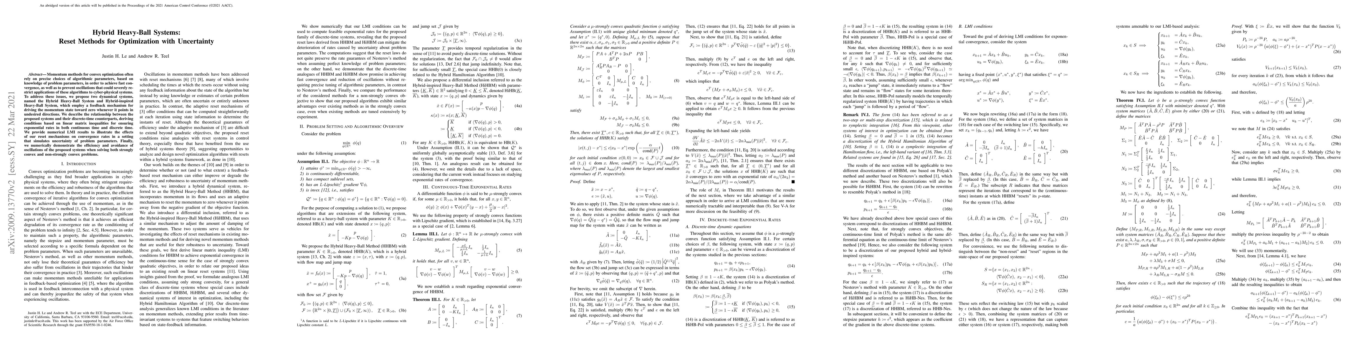 This paper proposes two hybrid dynamical systems, the Hybrid Heavy-Ball System and Hybrid-inspired Heavy-Ball System, to optimize convergence in uncertain convex optimization problems. The systems use reset mechanisms to manage momentum and avoid oscillations, with conditions derived via linear matrix inequalities ensuring exponential convergence rates.