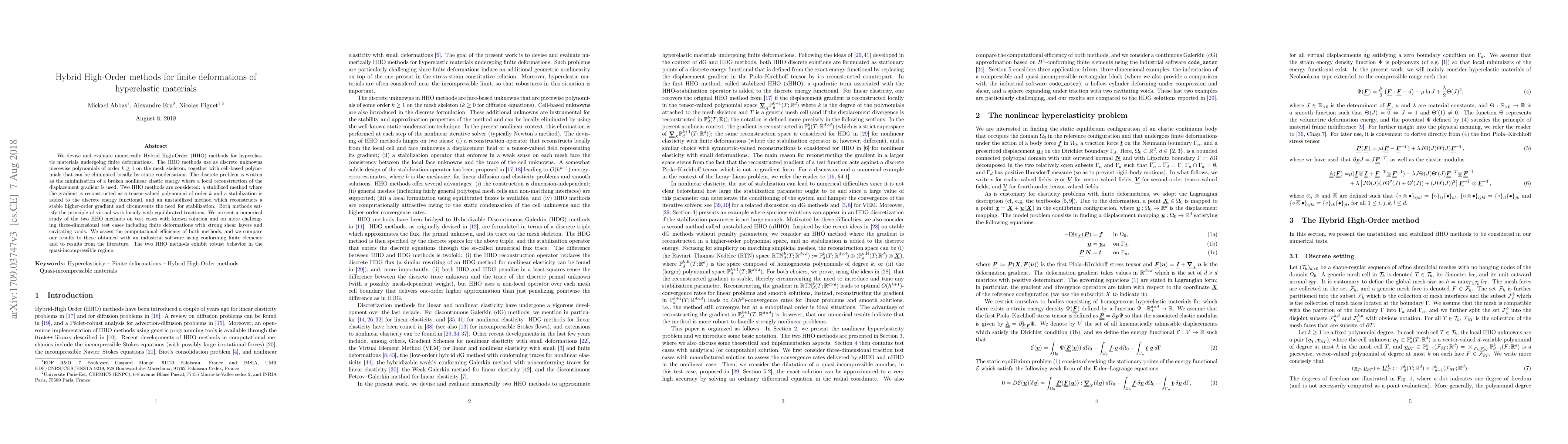We devise and evaluate numerically Hybrid High-Order (HHO) methods for hyperelastic materials undergoing finite deformations. The HHO methods use as discrete unknowns piecewise polynomials of order $k\ge1$ on the mesh skeleton, together with cell-based polynomials that can be eliminated locally by static condensation. The discrete problem is written as the minimization of the broken nonlinear elastic energy where a local reconstruction of the displacement gradient is used. Two HHO methods are considered: a stabilized method where the gradient is reconstructed as a tensor-valued polynomial of order $k$ and a stabilization is added to the discrete energy functional, and an unstabilized method which reconstructs a stable higher-order gradient and circumvents the need for stabilization. Both methods satisfy the principle of virtual work locally with equilibrated tractions. We present a numerical study of both HHO methods on test cases with known solution and on more challenging three-dimensional test cases including finite deformations with strong shear layers and cavitating voids. We assess the computational efficiency of both methods, and we compare our results to those obtained with an industrial software using conforming finite elements and to results from the literature. Both methods exhibit robust behavior in the quasi-incompressible regime.