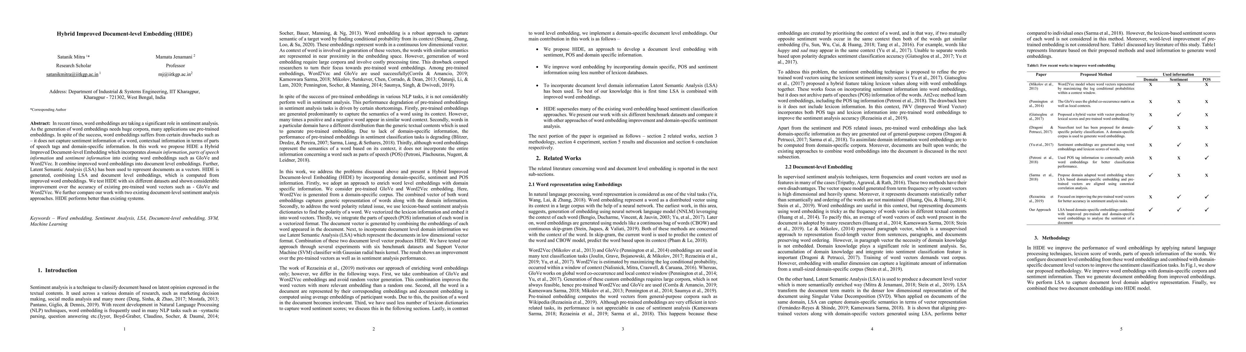 The paper proposes HIDE, a Hybrid Improved Document-level Embedding, which enhances existing word embeddings by incorporating domain, parts of speech, and sentiment information, and demonstrates significant improvements in sentiment analysis accuracy over pretrained vectors like GloVe and Word2Vec. HIDE combines Latent Semantic Analysis with improved word embeddings to generate superior document representations.