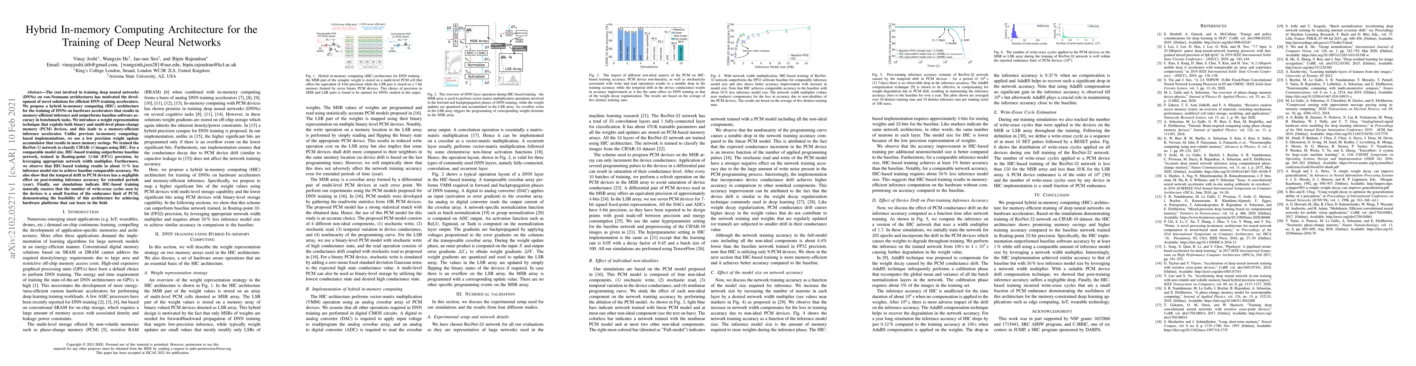 This paper proposes a hybrid in-memory computing architecture for efficient deep neural network training, utilizing binary and multi-level PCM devices. The approach results in 50% less inference model size and outperforms baseline networks while maintaining comparable accuracy.