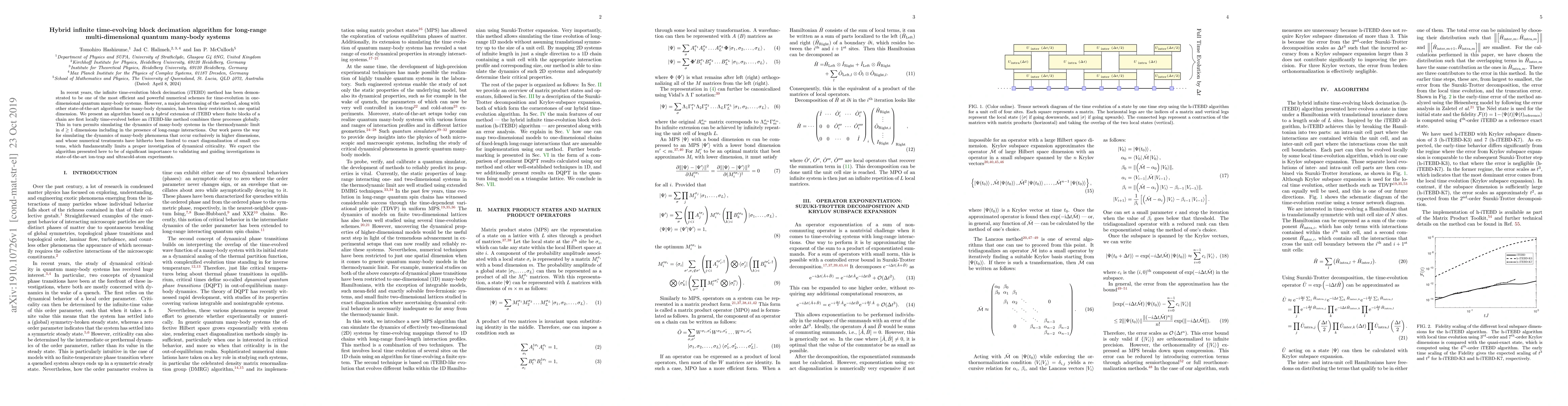 This paper introduces a hybrid infinite time-evolving block decimation (iTEBD) algorithm to efficiently simulate the dynamics of long-range multi-dimensional quantum many-body systems. The proposed method extends iTEBD to higher dimensions, enabling the study of phenomena previously limited to exact diagonalization of small systems.