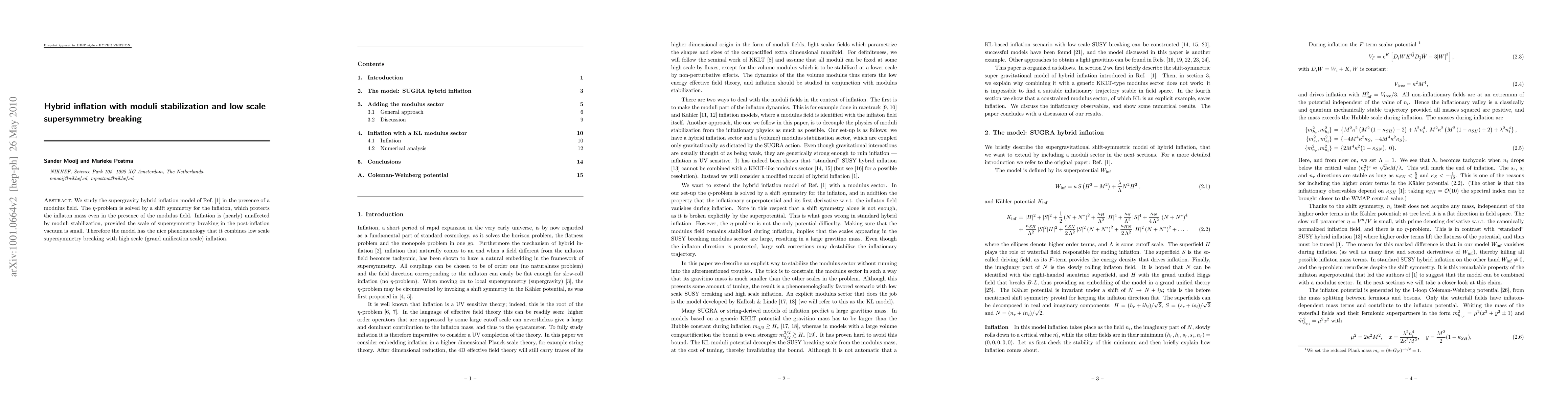 We study the supergravity hybrid inflation model of Ref.[1] in the presence of a modulus field. The eta-problem is solved by a shift symmetry for the inflaton, which protects the inflaton mass even in the presence of the modulus field. Inflation is (nearly) unaffected by moduli stabilization, provided the scale of supersymmetry breaking in the post-inflation vacuum is small. Therefore the model has the nice phenomenology that it combines low scale supersymmetry breaking with high scale (grand unification scale) inflation.