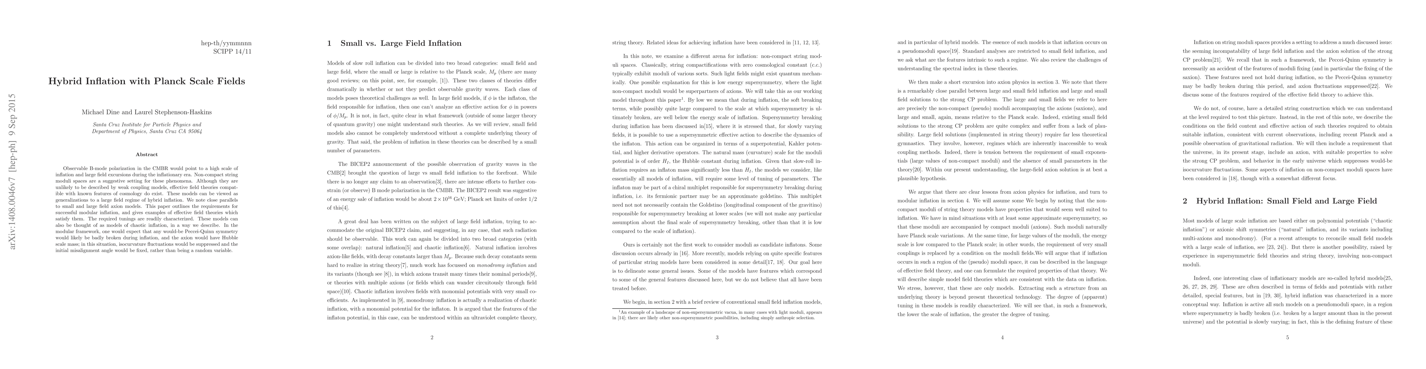 The BICEP2 observations, if confirmed, point to a high scale of inflation and large field excursions during the inflationary era. Non-compact string moduli spaces are a suggestive setting for these phenomena. While unlikely to be described by weak coupling models, one can write down plausible effective field theories compatible with known features of cosmology. These models can be viewed as generalizations to a large field regime of hybrid inflation. We note close parallels to small and large field axion models. This paper outlines the requirements for successful modular inflation, and gives examples of effective field theories which satisfy them. The required tunings are readily characterized. These models can also be thought of as models of chaotic inflation, in a way we describe. In the modular framework, one would expect that any would-be Peccei-Quinn symmetry would likely be badly broken during inflation, and the axion would have Hubble scale mass; in this situation, isocurvature fluctuations would be suppressed and the initial misalignment angle would be fixed, rather than being a random variable.