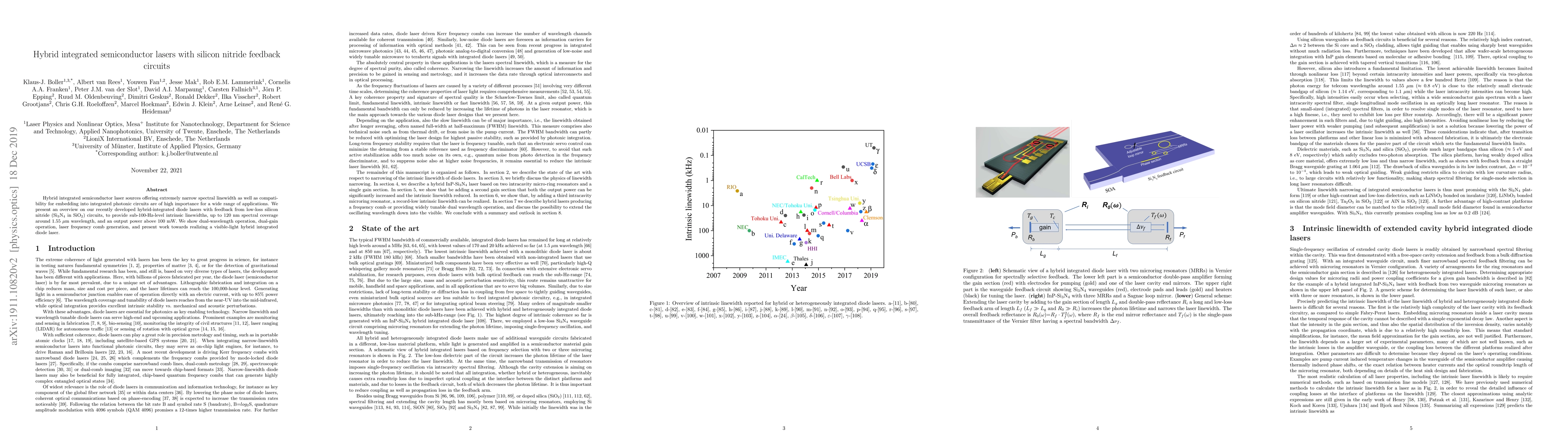 The paper discusses the development of hybrid-integrated semiconductor lasers with silicon nitride feedback circuits, achieving narrow spectral linewidths, dual-wavelength and dual-gain operations, and the potential for visible-light laser integration. The lasers demonstrate sub-100-Hz intrinsic linewidths, over 120 nm spectral coverage near 1.55 um, and output power exceeding 100 mW.