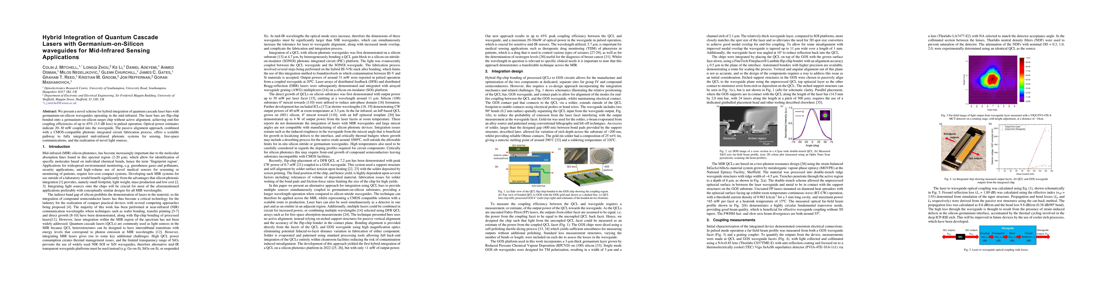 We present a novel scheme for hybrid integration of quantum cascade laser bars with germanium-on-silicon waveguides operating in the mid-infrared. The laser bars are flip-chip bonded onto a germanium-on-silicon target chip without active alignment, acheiving end-fire coupling efficiency of up to 45% (3.5 dB loss) in pulsed operation. Optical power estimates indicate 20-30 mW coupled into the waveguides. The passive alignment approach, combined with a CMOS-compatible photonic integrated circuit fabrication process, offers a scalable pathway to fully integrated mid-infrared photonic systems for sensing, free-space communications, and the realisation of novel light sources.