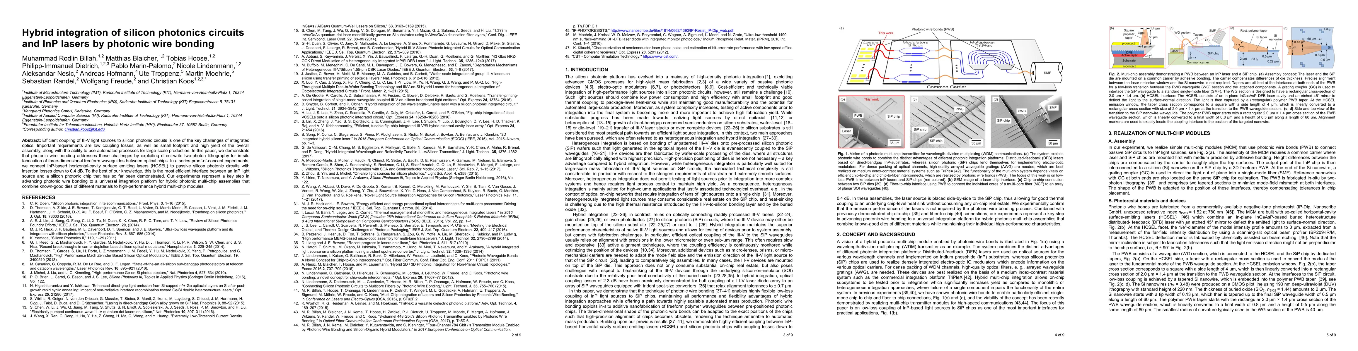 The research demonstrates photonic wire bonding for hybrid integration of InP lasers and silicon photonic circuits, using direct-write two-photon lithography to fabricate three-dimensional freeform waveguides in-situ.