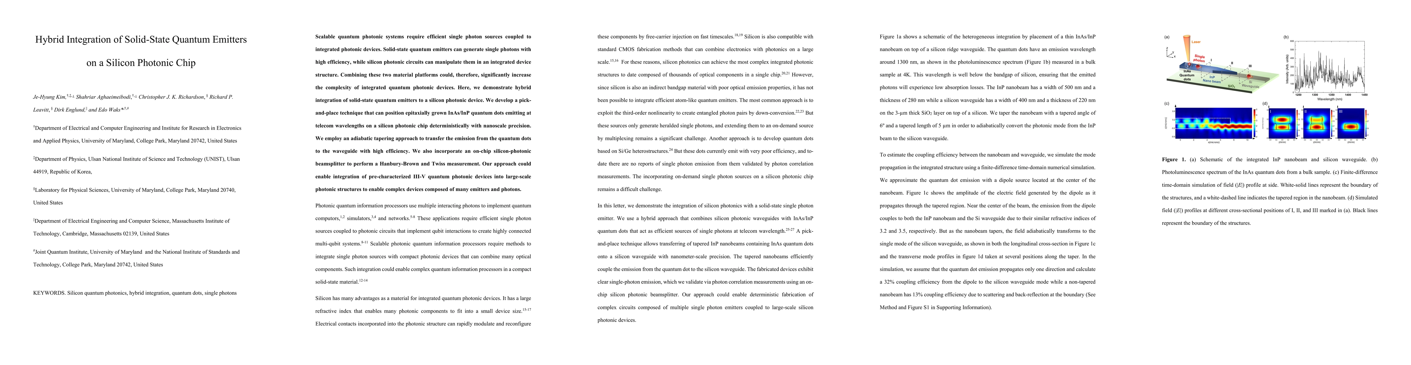 This paper demonstrates a hybrid integration technique for solid-state quantum emitters, specifically InAs/InP quantum dots, onto silicon photonic chips using pick-and-place methods with nanoscale precision. An adiabatic tapering approach is used to efficiently transfer quantum dot emissions into the silicon waveguide, enabling scalable and complex quantum photonic systems.