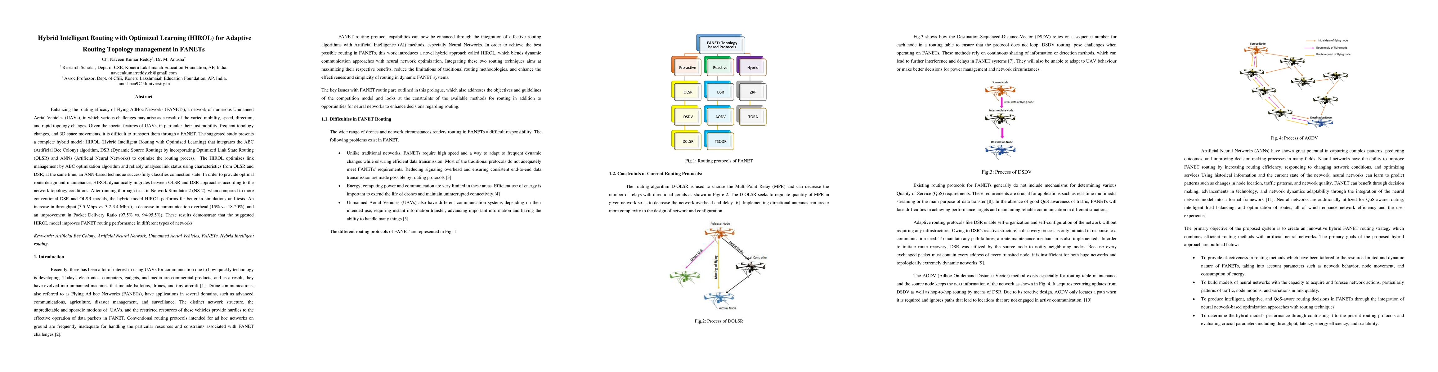 Enhancing the routing efficacy of Flying AdHoc Networks (FANETs), a network of numerous Unmanned Aerial Vehicles (UAVs), in which various challenges may arise as a result of the varied mobility, speed, direction, and rapid topology changes. Given the special features of UAVs, in particular their fast mobility, frequent topology changes, and 3D space movements, it is difficult to transport them through a FANET. The suggested study presents a complete hybrid model: HIROL (Hybrid Intelligent Routing with Optimized Learning) that integrates the ABC (Artificial Bee Colony) algorithm, DSR (Dynamic Source Routing) by incorporating Optimized Link State Routing (OLSR) and ANNs (Artificial Neural Networks) to optimize the routing process. The HIROL optimizes link management by ABC optimization algorithm and reliably analyses link status using characteristics from OLSR and DSR; at the same time, an ANN-based technique successfully classifies connection state. In order to provide optimal route design and maintenance, HIROL dynamically migrates between OLSR and DSR approaches according to the network topology conditions. After running thorough tests in Network Simulator 2 (NS-2), when compared to more conventional DSR and OLSR models, the hybrid model HIROL performs far better in simulations and tests. An increase in throughput (3.5 Mbps vs. 3.2-3.4 Mbps), a decrease in communication overhead (15% vs. 18-20%), and an improvement in Packet Delivery Ratio (97.5% vs. 94-95.5%). These results demonstrate that the suggested HIROL model improves FANET routing performance in different types of networks.