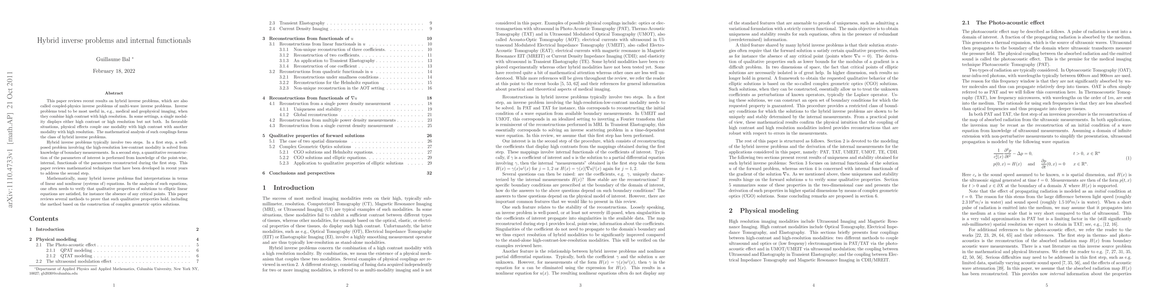 This paper reviews recent results on hybrid inverse problems, which are also called coupled-physics inverse problems of multi-wave inverse problems. Inverse problems tend to be most useful in, e.g., medical and geophysical imaging, when they combine high contrast with high resolution. In some settings, a single modality displays either high contrast or high resolution but not both. In favorable situations, physical effects couple one modality with high contrast with another modality with high resolution. The mathematical analysis of such couplings forms the class of hybrid inverse problems. Hybrid inverse problems typically involve two steps. In a first step, a well-posed problem involving the high-resolution low-contrast modality is solved from knowledge of boundary measurements. In a second step, a quantitative reconstruction of the parameters of interest is performed from knowledge of the point-wise, internal, functionals of the parameters reconstructed during the first step. This paper reviews mathematical techniques that have been developed in recent years to address the second step. Mathematically, many hybrid inverse problems find interpretations in terms of linear and nonlinear (systems of) equations. In the analysis of such equations, one often needs to verify that qualitative properties of solutions to elliptic linear equations are satisfied, for instance the absence of any critical points. This paper reviews several methods to prove that such qualitative properties hold, including the method based on the construction of complex geometric optics solutions.