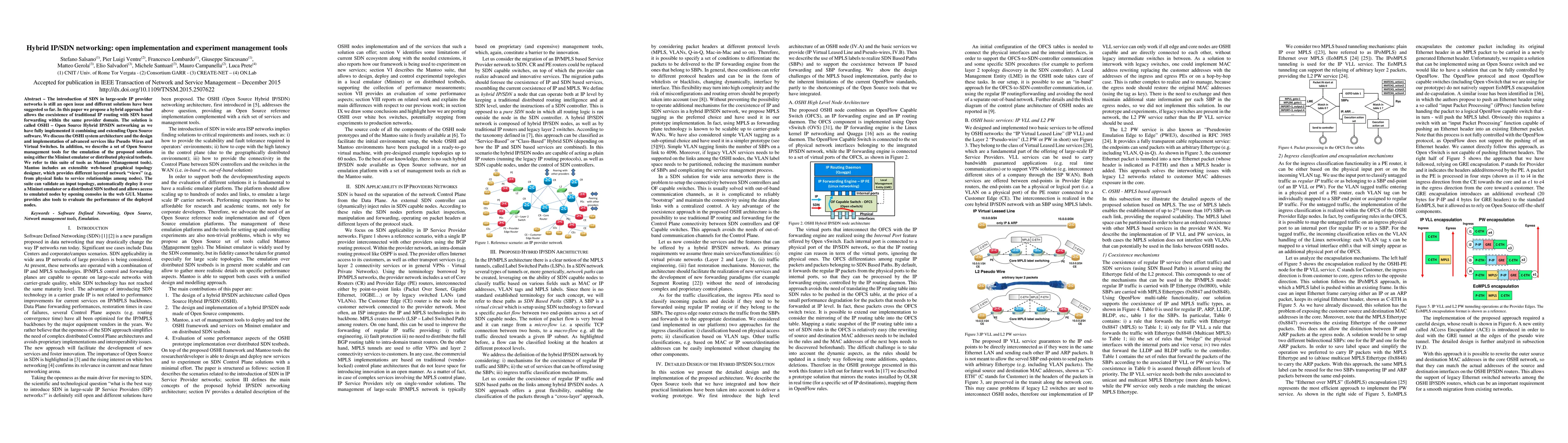 This paper proposes a hybrid IP/SDN networking approach called OSHI, implemented using Open Source software, enabling coexistence of traditional IP routing and SDN forwarding. It introduces Mantoo, a suite of management tools for emulating and managing the hybrid network, featuring a web-based graphical topology designer, performance evaluation tools, and console access for emulated nodes.