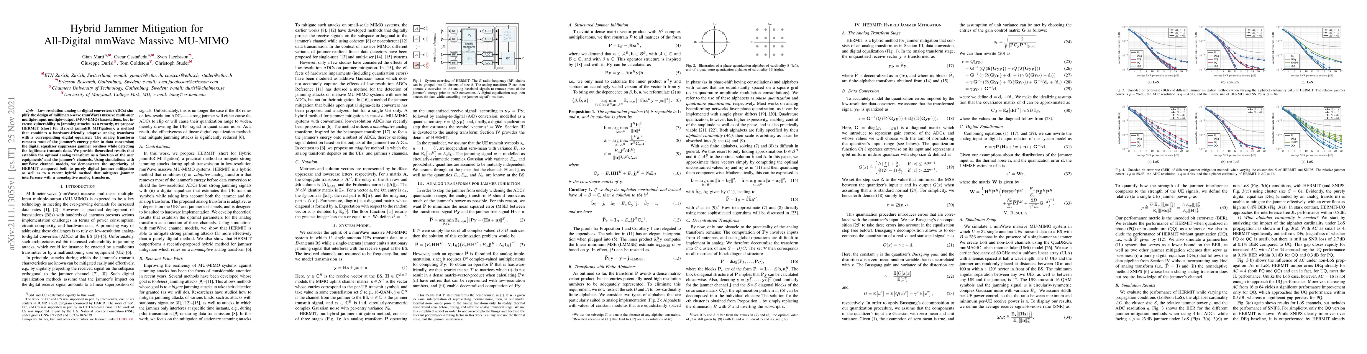 The paper proposes HERMIT, a hybrid method combining adaptive analog and digital techniques to mitigate jamming attacks in low-resolution ADCs for mmWave massive MU-MIMO systems. HERMIT's analog transform reduces jammer energy before conversion, while the digital equalizer further suppresses residual interference, outperforming both purely digital and nonadaptive hybrid approaches in simulations.