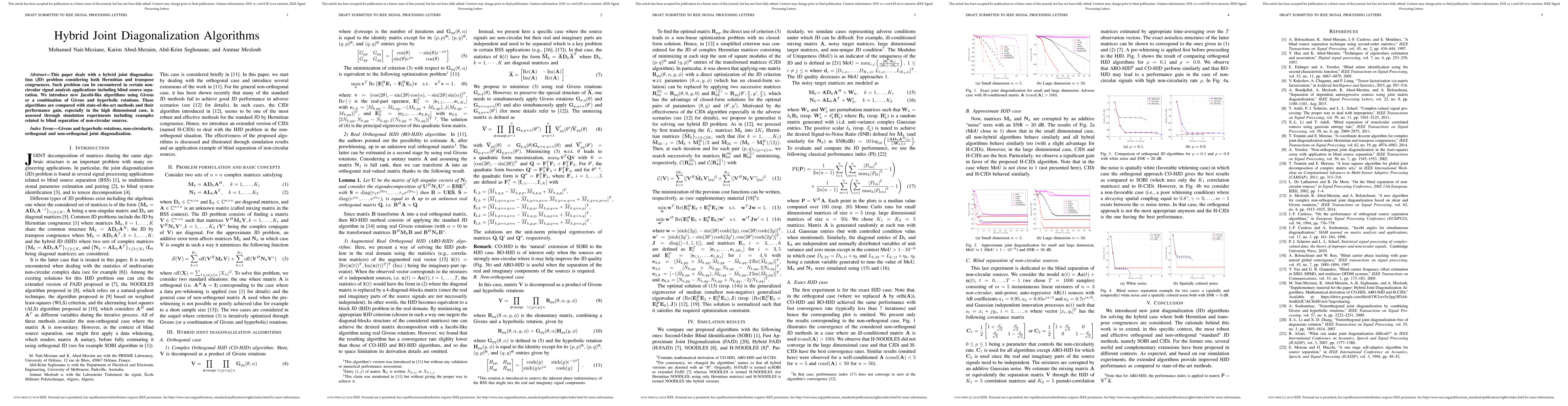 This paper introduces new hybrid joint diagonalization algorithms using Givens and hyperbolic rotations for non-circular signal analysis, particularly in blind source separation. Simulation results show performance gains over existing methods, especially in high-dimensional scenarios.