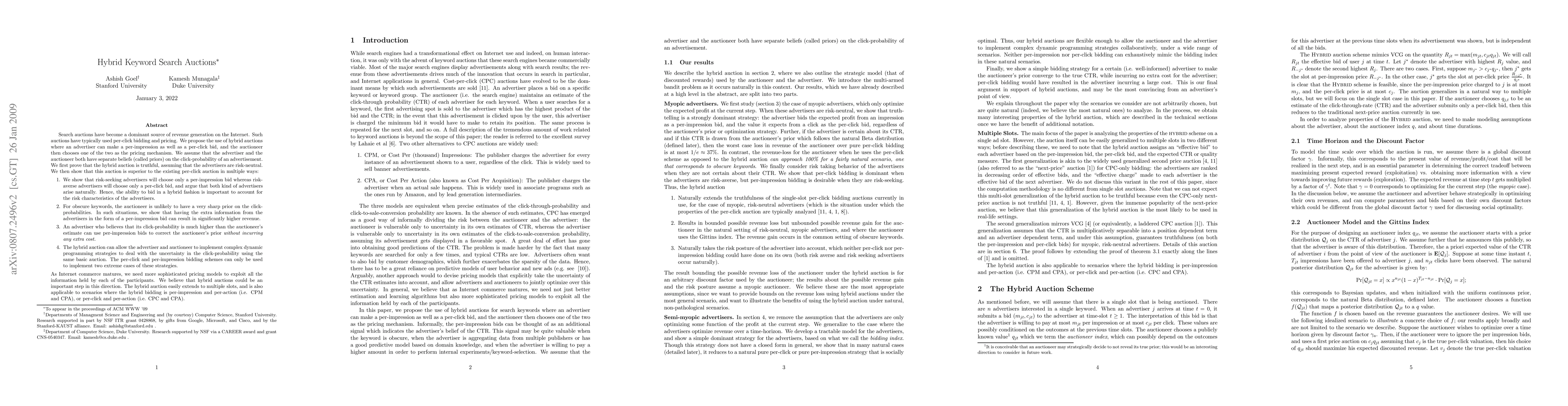 Search auctions have become a dominant source of revenue generation on the Internet. Such auctions have typically used per-click bidding and pricing. We propose the use of hybrid auctions where an advertiser can make a per-impression as well as a per-click bid, and the auctioneer then chooses one of the two as the pricing mechanism. We assume that the advertiser and the auctioneer both have separate beliefs (called priors) on the click-probability of an advertisement. We first prove that the hybrid auction is truthful, assuming that the advertisers are risk-neutral. We then show that this auction is superior to the existing per-click auction in multiple ways: 1) It takes into account the risk characteristics of the advertisers. 2) For obscure keywords, the auctioneer is unlikely to have a very sharp prior on the click-probabilities. In such situations, the hybrid auction can result in significantly higher revenue. 3) An advertiser who believes that its click-probability is much higher than the auctioneer's estimate can use per-impression bids to correct the auctioneer's prior without incurring any extra cost. 4) The hybrid auction can allow the advertiser and auctioneer to implement complex dynamic programming strategies. As Internet commerce matures, we need more sophisticated pricing models to exploit all the information held by each of the participants. We believe that hybrid auctions could be an important step in this direction.