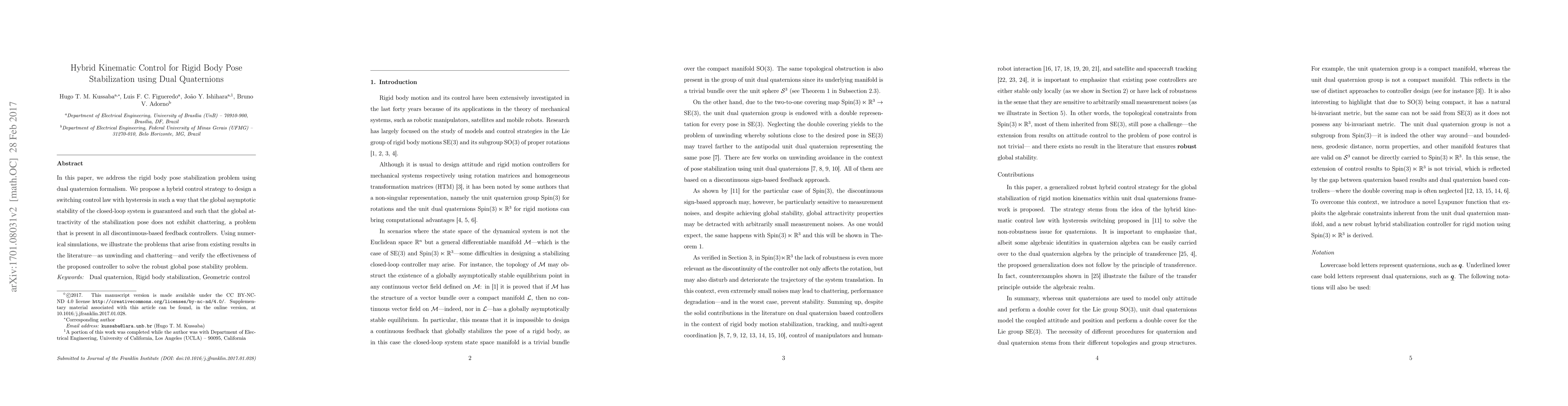 This paper proposes a hybrid kinematic control strategy using dual quaternions to stabilize the pose of rigid bodies, ensuring global asymptotic stability and eliminating chattering issues inherent in discontinuous controllers. Numerical simulations demonstrate the effectiveness of the proposed method in addressing existing problems like unwinding and chattering.