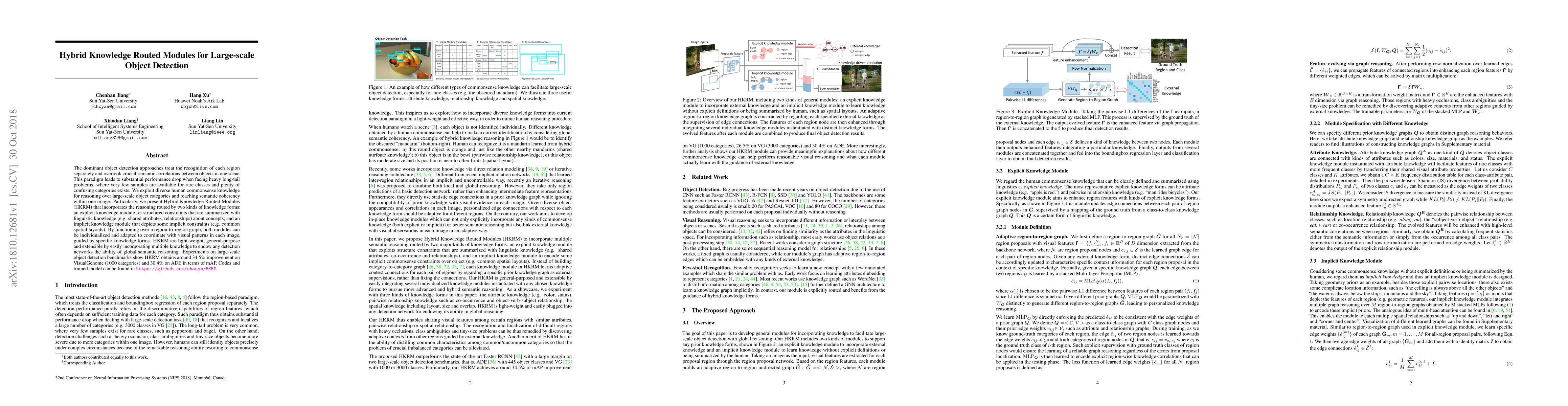 This paper introduces Hybrid Knowledge Routed Modules (HKRM) to enhance large-scale object detection by incorporating explicit and implicit knowledge forms to reason over object relationships and spatial layouts, leading to significant performance improvements on benchmarks. The modules achieve around 34.5% and 30.4% mAP gains on VisualGenome and ADE, respectively.