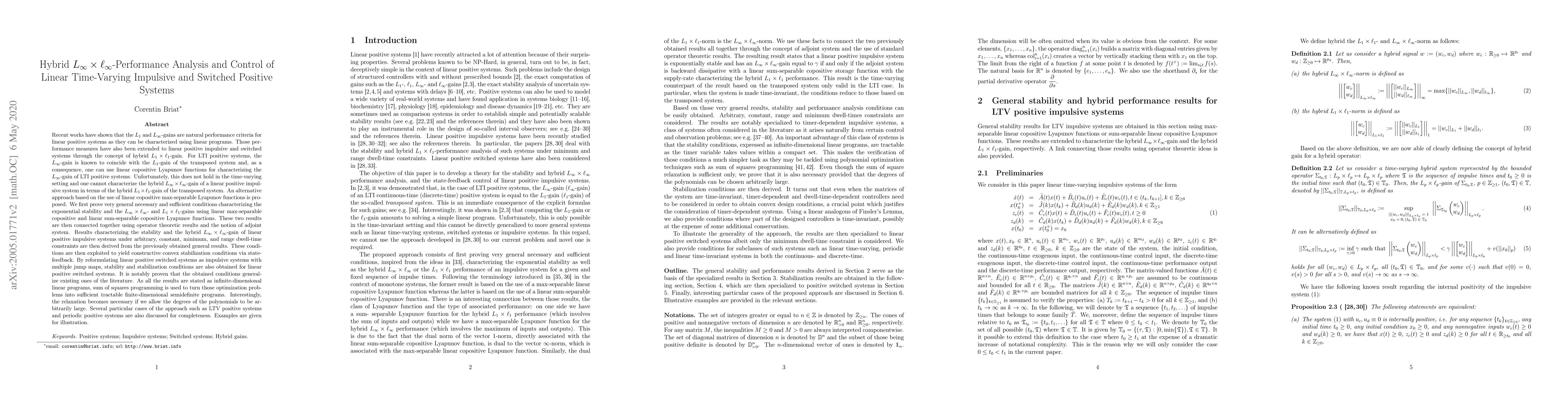 Recent works have shown that the $L_1$ and $L_\infty$-gains are natural performance criteria for linear positive systems as they can be characterized using linear programs. Those performance measures have also been extended to linear positive impulsive and switched systems through the concept of hybrid $L_1\times\ell_1$-gain. For LTI positive systems, the $L_\infty$-gain is known to coincide with the $L_1$-gain of the transposed system and, as a consequence, one can use linear copositive Lyapunov functions for characterizing the $L_\infty$-gain of LTI positive systems. Unfortunately, this does not hold in the time-varying setting and one cannot characterize the hybrid $L_\infty\times\ell_\infty$-gain of a linear positive impulsive system in terms of the hybrid $L_1\times\ell_1$-gain of the transposed system. An alternative approach based on the use of linear copositive max-separable Lyapunov functions is proposed. We first prove very general necessary and sufficient conditions characterizing the exponential stability and the $L_\infty\times\ell_\infty$- and $L_1\times\ell_1$-gains using linear max-separable copositive and linear sum-separable copositive Lyapunov functions. Results characterizing the stability and the hybrid $L_\infty\times\ell_\infty$-gain of linear positive impulsive systems under arbitrary, constant, minimum, and range dwell-time constraints are then derived from the previously obtained general results. These conditions are then exploited to yield constructive convex stabilization conditions via state-feedback. By reformulating linear positive switched systems as impulsive systems with multiple jump maps, stability and stabilization conditions are also obtained for linear positive switched systems. It is notably proven that the obtained conditions generalize existing ones of the literature.