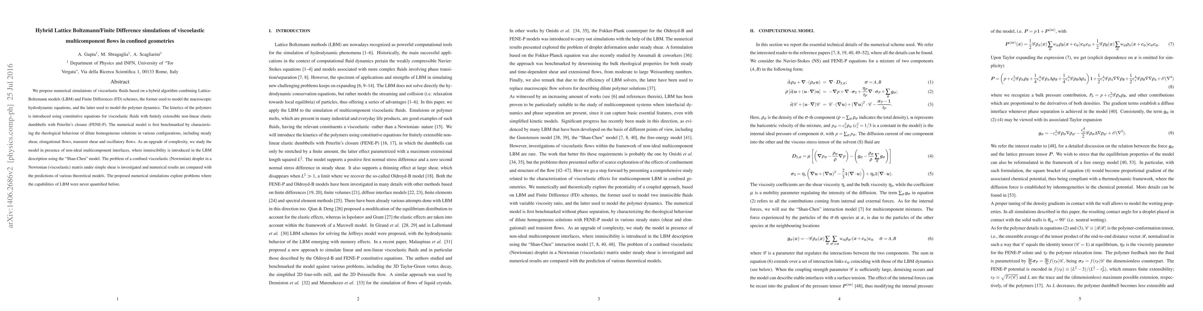 This paper presents a hybrid Lattice-Boltzmann/Finite Difference simulation method to model viscoelastic multicomponent flows in confined geometries, combining LBM for hydrodynamics and FD for polymer dynamics. The model is validated and applied to study complex rheological behaviors and interactions at non-ideal interfaces.