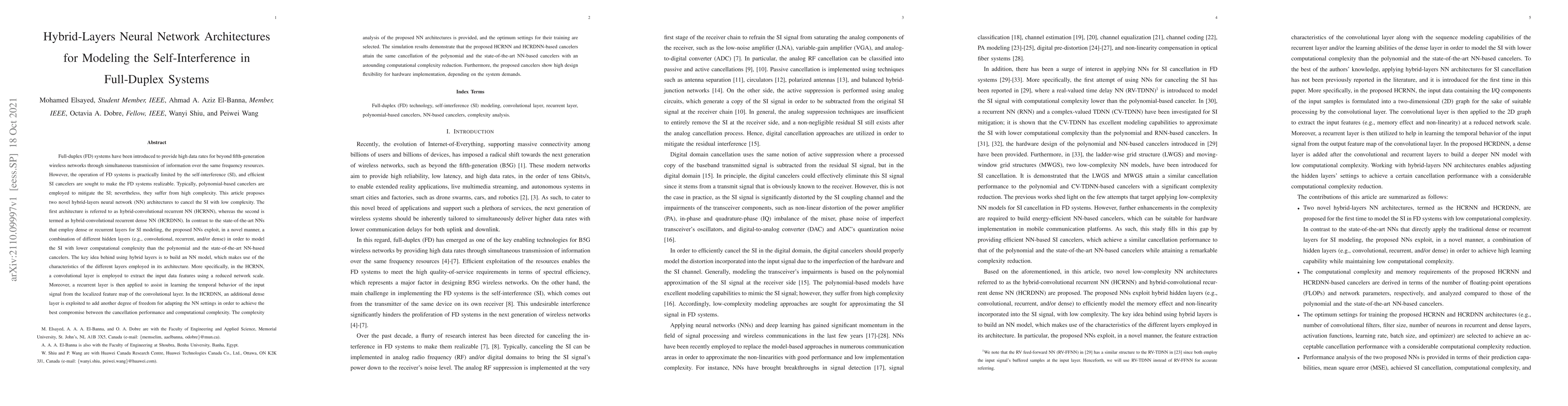 Researchers propose two neural network architectures to cancel self-interference in full-duplex systems, achieving lower computational complexity than existing methods.