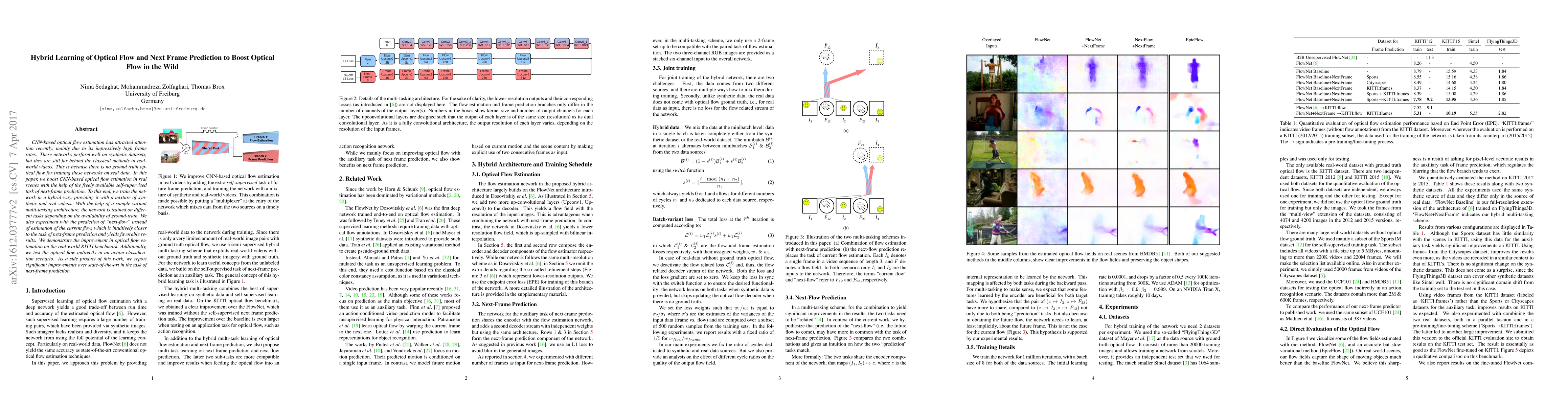 CNN-based optical flow estimation has attracted attention recently, mainly due to its impressively high frame rates. These networks perform well on synthetic datasets, but they are still far behind the classical methods in real-world videos. This is because there is no ground truth optical flow for training these networks on real data. In this paper, we boost CNN-based optical flow estimation in real scenes with the help of the freely available self-supervised task of next-frame prediction. To this end, we train the network in a hybrid way, providing it with a mixture of synthetic and real videos. With the help of a sample-variant multi-tasking architecture, the network is trained on different tasks depending on the availability of ground-truth. We also experiment with the prediction of "next-flow" instead of estimation of the current flow, which is intuitively closer to the task of next-frame prediction and yields favorable results. We demonstrate the improvement in optical flow estimation on the real-world KITTI benchmark. Additionally, we test the optical flow indirectly in an action classification scenario. As a side product of this work, we report significant improvements over state-of-the-art in the task of next-frame prediction.