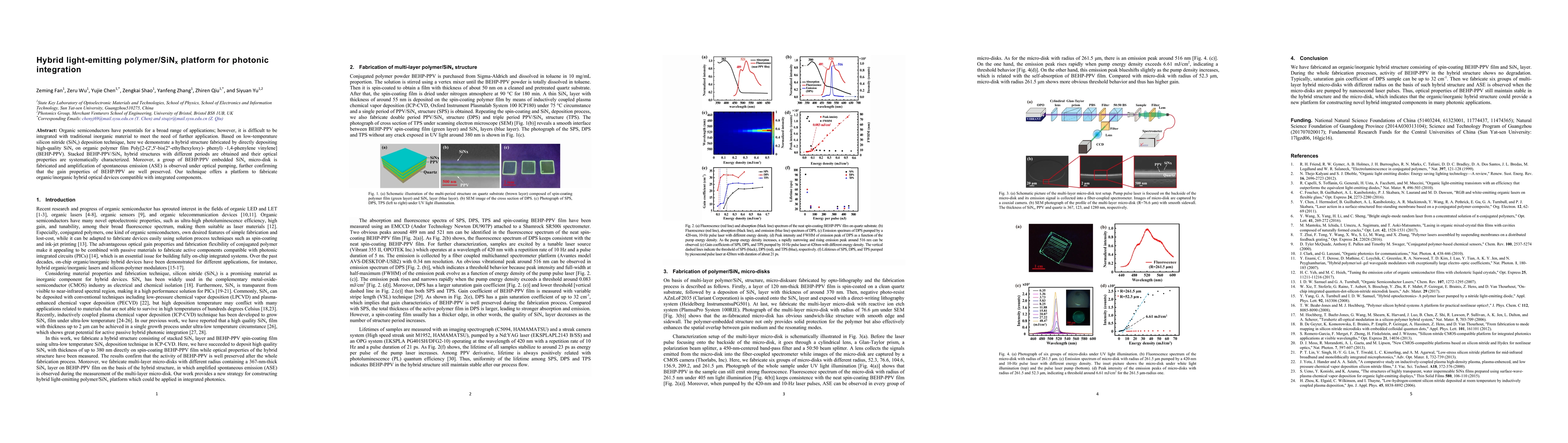 Organic semiconductors have potentials for a broad range of applications; however, it is difficult to be integrated with traditional inorganic material to meet the need of further application. Based on low-temperature silicon nitride (SiNx) deposition technique, here we demonstrate a hybrid structure fabricated by directly depositing high-quality SiNx on organic polymer film Poly[2-(2',5'-bis(2"-ethylhexyloxy)- phenyl) -1,4-phenylene vinylene] (BEHP-PPV). Stacked BEHP-PPV/SiNx hybrid structures with different periods are obtained and their optical properties are systematically characterized. Moreover, a group of BEHP/PPV embedded SiNx micro-disk is fabricated and amplification of spontaneous emission (ASE) is observed under optical pumping, further confirming that the gain properties of BEHP/PPV are well preserved. Our technique offers a platform to fabricate organic/inorganic hybrid optical devices compatible with integrated components.