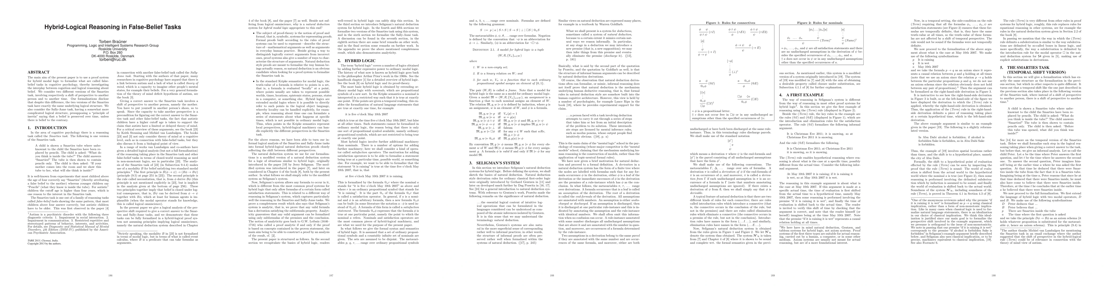 This paper formalizes false-belief tasks in cognitive psychology using a hybrid modal logic proof system, revealing identical logical structures in two versions of the Smarties task despite differing perspectives. It also examines the Sally-Anne task, which involves a "principle of inertia" for belief preservation over time.