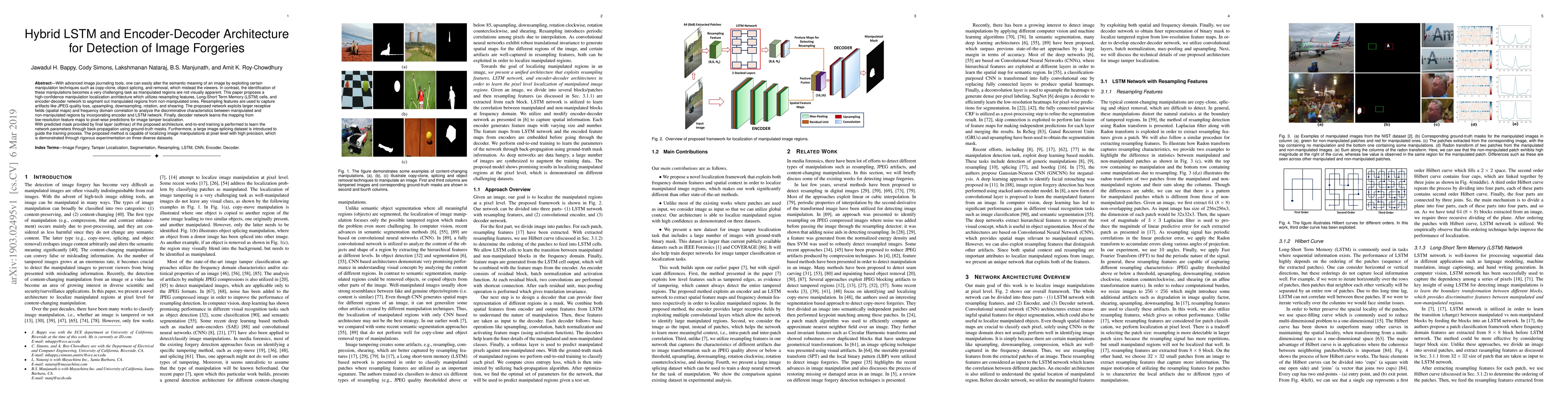 This paper proposes a hybrid LSTM and encoder-decoder architecture for detecting image forgeries by localizing manipulated regions. It uses resampling features and large receptive fields to capture discriminative characteristics, achieving high precision in pixel-level manipulation localization through rigorous experimentation on multiple datasets.