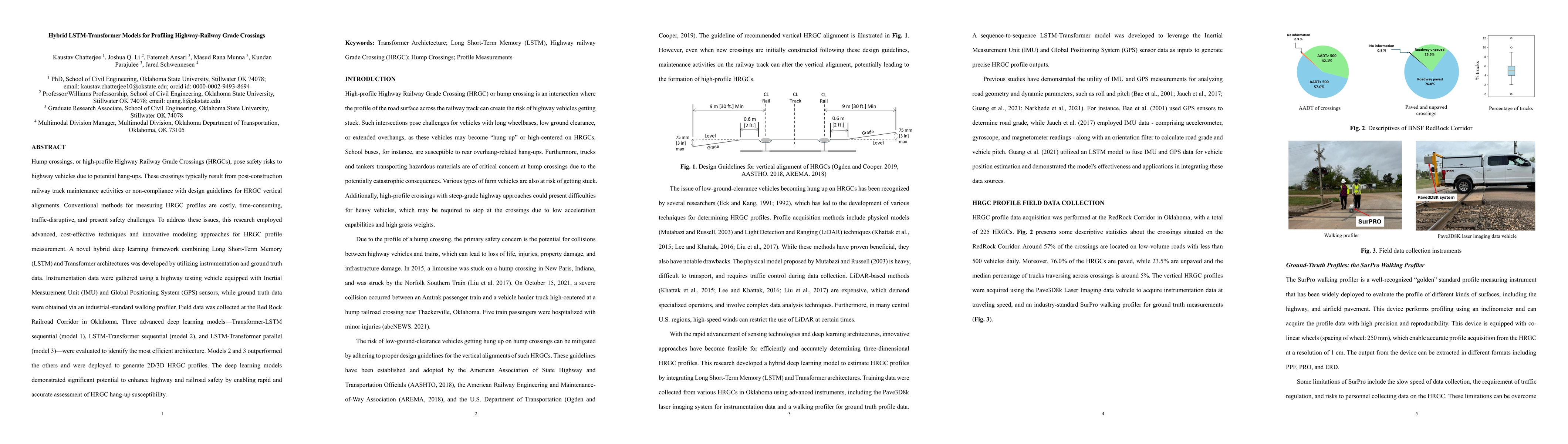Hump crossings, or high-profile Highway Railway Grade Crossings (HRGCs), pose safety risks to highway vehicles due to potential hang-ups. These crossings typically result from post-construction railway track maintenance activities or non-compliance with design guidelines for HRGC vertical alignments. Conventional methods for measuring HRGC profiles are costly, time-consuming, traffic-disruptive, and present safety challenges. To address these issues, this research employed advanced, cost-effective techniques and innovative modeling approaches for HRGC profile measurement. A novel hybrid deep learning framework combining Long Short-Term Memory (LSTM) and Transformer architectures was developed by utilizing instrumentation and ground truth data. Instrumentation data were gathered using a highway testing vehicle equipped with Inertial Measurement Unit (IMU) and Global Positioning System (GPS) sensors, while ground truth data were obtained via an industrial-standard walking profiler. Field data was collected at the Red Rock Railroad Corridor in Oklahoma. Three advanced deep learning models Transformer-LSTM sequential (model 1), LSTM-Transformer sequential (model 2), and LSTM-Transformer parallel (model 3) were evaluated to identify the most efficient architecture. Models 2 and 3 outperformed the others and were deployed to generate 2D/3D HRGC profiles. The deep learning models demonstrated significant potential to enhance highway and railroad safety by enabling rapid and accurate assessment of HRGC hang-up susceptibility.