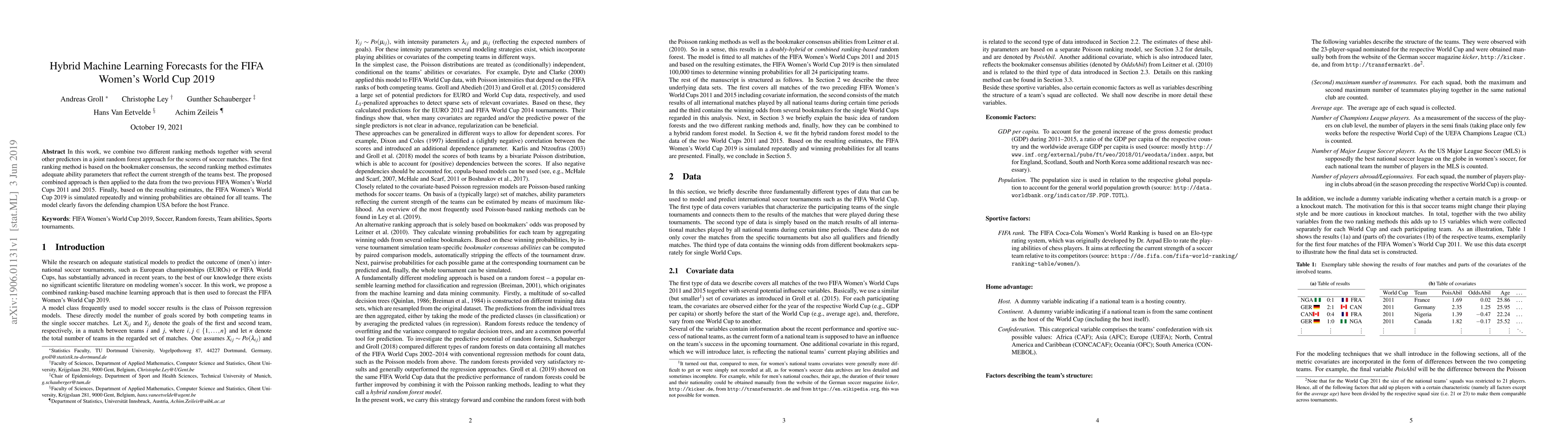 A hybrid machine learning approach combines two ranking methods to forecast soccer match scores in the 2019 FIFA Women's World Cup, favoring defending champion USA before host France.