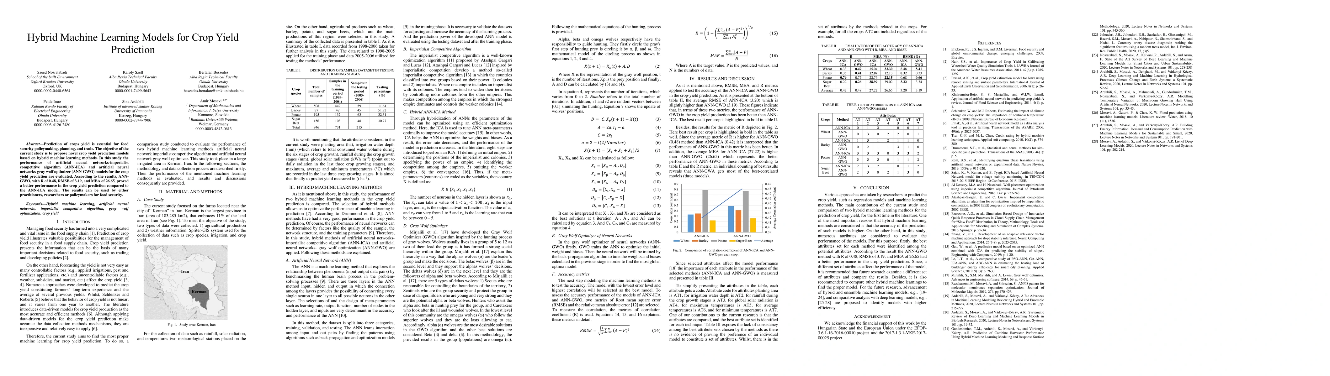This study proposes hybrid machine learning models, specifically ANN-ICA and ANN-GWO, for predicting crop yields, with ANN-GWO showing superior performance in terms of accuracy metrics. The findings can aid in food security planning and policymaking.