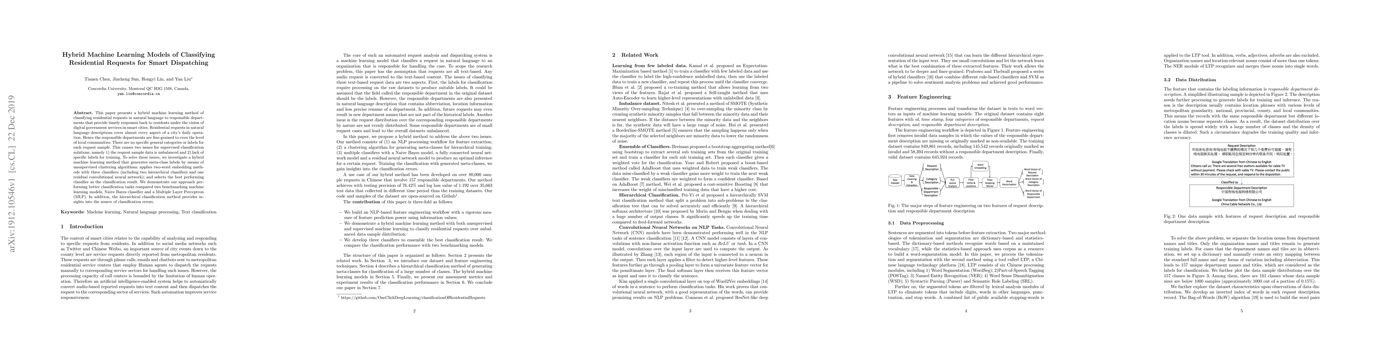 This paper presents a hybrid machine learning method of classifying residential requests in natural language to responsible departments that provide timely responses back to residents under the vision of digital government services in smart cities. Residential requests in natural language descriptions cover almost every aspect of a city's daily operation. Hence the responsible departments are fine-grained to even the level of local communities. There are no specific general categories or labels for each request sample. This causes two issues for supervised classification solutions, namely (1) the request sample data is unbalanced and (2) lack of specific labels for training. To solve these issues, we investigate a hybrid machine learning method that generates meta-class labels by means of unsupervised clustering algorithms; applies two-word embedding methods with three classifiers (including two hierarchical classifiers and one residual convolutional neural network); and selects the best performing classifier as the classification result. We demonstrate our approach performing better classification tasks compared to two benchmarking machine learning models, Naive Bayes classifier and a Multiple Layer Perceptron (MLP). In addition, the hierarchical classification method provides insights into the source of classification errors.