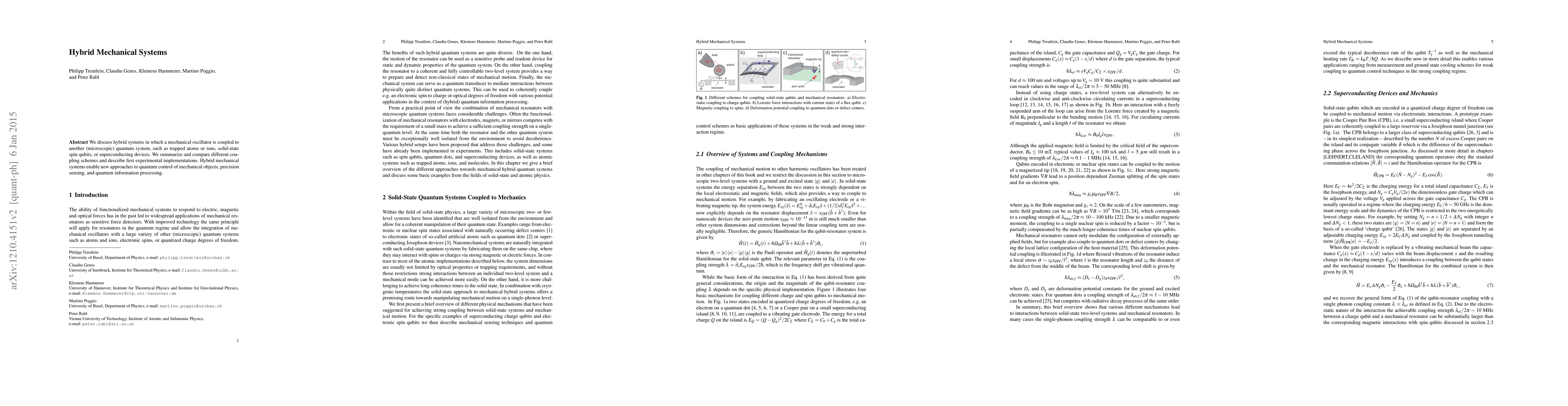 We discuss hybrid systems in which a mechanical oscillator is coupled to another (microscopic) quantum system, such as trapped atoms or ions, solid-state spin qubits, or superconducting devices. We summarize and compare different coupling schemes and describe first experimental implementations. Hybrid mechanical systems enable new approaches to quantum control of mechanical objects, precision sensing, and quantum information processing.