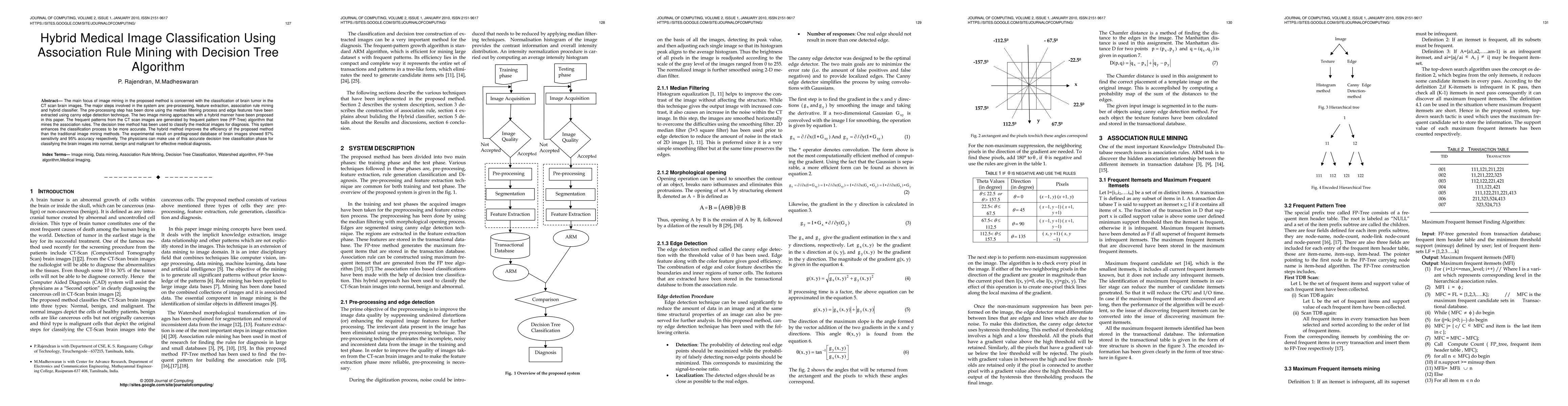 The main focus of image mining in the proposed method is concerned with the classification of brain tumor in the CT scan brain images. The major steps involved in the system are: pre-processing, feature extraction, association rule mining and hybrid classifier. The pre-processing step has been done using the median filtering process and edge features have been extracted using canny edge detection technique. The two image mining approaches with a hybrid manner have been proposed in this paper. The frequent patterns from the CT scan images are generated by frequent pattern tree (FP-Tree) algorithm that mines the association rules. The decision tree method has been used to classify the medical images for diagnosis. This system enhances the classification process to be more accurate. The hybrid method improves the efficiency of the proposed method than the traditional image mining methods. The experimental result on prediagnosed database of brain images showed 97% sensitivity and 95% accuracy respectively. The physicians can make use of this accurate decision tree classification phase for classifying the brain images into normal, benign and malignant for effective medical diagnosis.