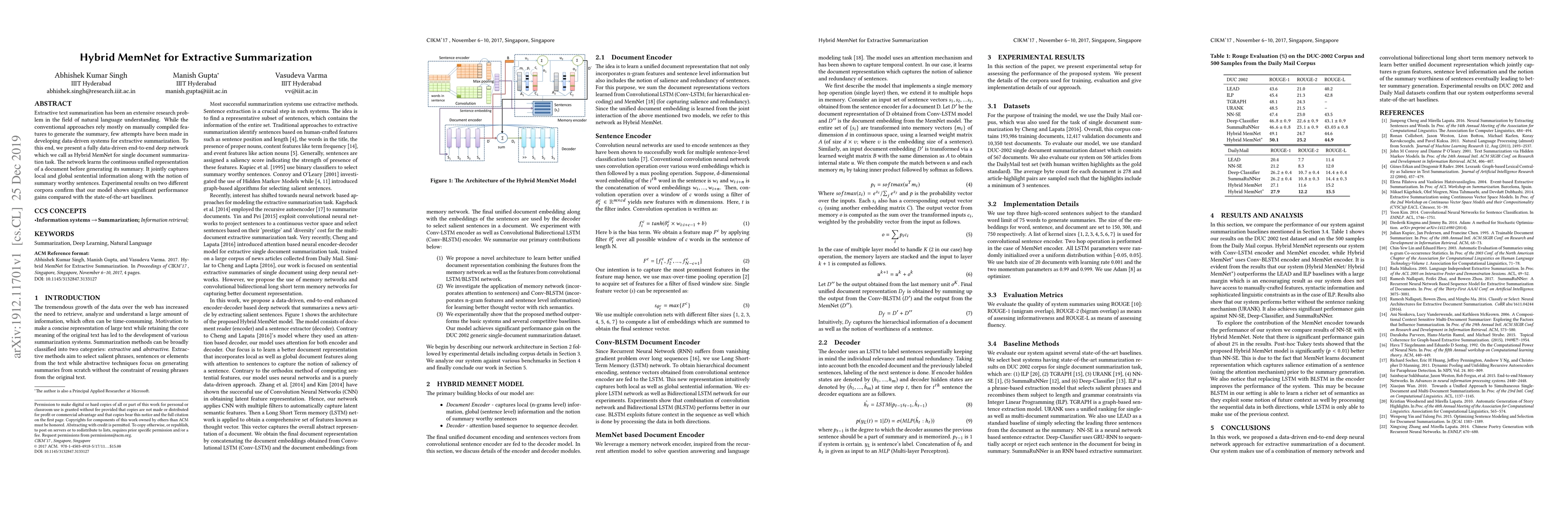 Extractive text summarization has been an extensive research problem in the field of natural language understanding. While the conventional approaches rely mostly on manually compiled features to generate the summary, few attempts have been made in developing data-driven systems for extractive summarization. To this end, we present a fully data-driven end-to-end deep network which we call as Hybrid MemNet for single document summarization task. The network learns the continuous unified representation of a document before generating its summary. It jointly captures local and global sentential information along with the notion of summary worthy sentences. Experimental results on two different corpora confirm that our model shows significant performance gains compared with the state-of-the-art baselines.