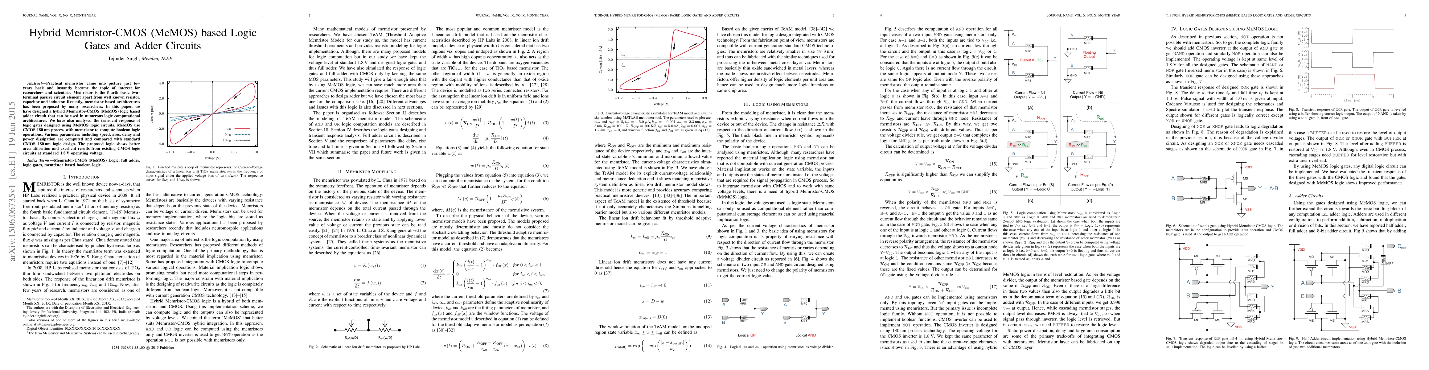 Practical memristor came into picture just few years back and instantly became the topic of interest for researchers and scientists. Memristor is the fourth basic two-terminal passive circuit element apart from well known resistor, capacitor and inductor. Recently, memristor based architectures has been proposed by many researchers. In this paper, we have designed a hybrid Memristor-CMOS (MeMOS) logic based adder circuit that can be used in numerous logic computational architectures. We have also analyzed the transient response of logic gates designed using MeMOS logic circuits. MeMOS use CMOS 180 nm process with memristor to compute boolean logic operations. Various parameters including speed, ares, delay and power dissipation are computed and compared with standard CMOS 180 nm logic design. The proposed logic shows better area utilization and excellent results from existing CMOS logic circuits at standard 1.8 V operating voltage.