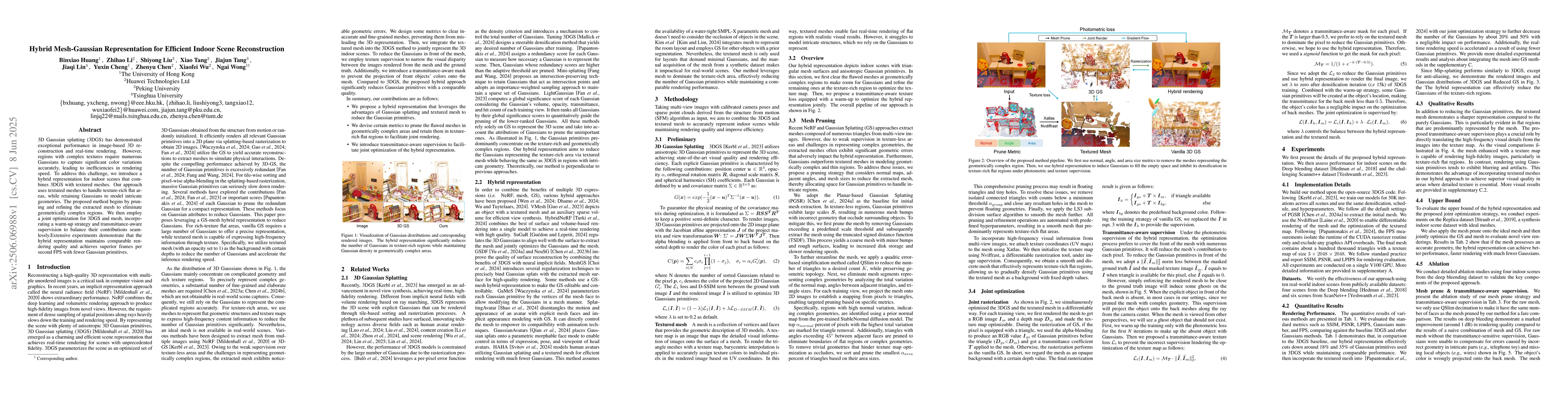 3D Gaussian splatting (3DGS) has demonstrated exceptional performance in image-based 3D reconstruction and real-time rendering. However, regions with complex textures require numerous Gaussians to capture significant color variations accurately, leading to inefficiencies in rendering speed. To address this challenge, we introduce a hybrid representation for indoor scenes that combines 3DGS with textured meshes. Our approach uses textured meshes to handle texture-rich flat areas, while retaining Gaussians to model intricate geometries. The proposed method begins by pruning and refining the extracted mesh to eliminate geometrically complex regions. We then employ a joint optimization for 3DGS and mesh, incorporating a warm-up strategy and transmittance-aware supervision to balance their contributions seamlessly.Extensive experiments demonstrate that the hybrid representation maintains comparable rendering quality and achieves superior frames per second FPS with fewer Gaussian primitives.