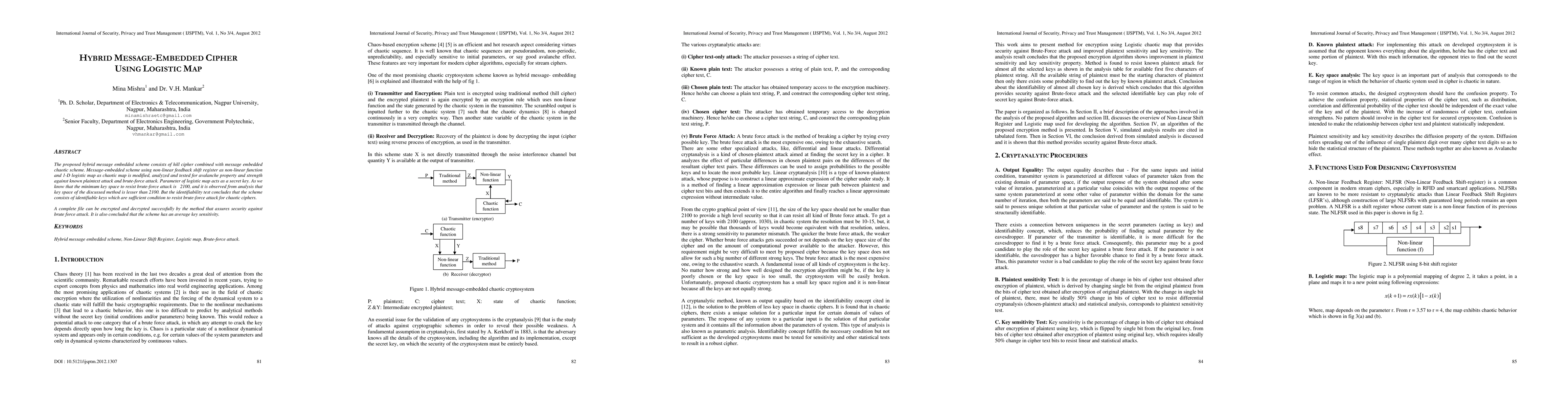 The proposed hybrid message embedded scheme consists of hill cipher combined with message embedded chaotic scheme. Message-embedded scheme using non-linear feedback shift register as non-linear function and 1-D logistic map as chaotic map is modified, analyzed and tested for avalanche property and strength against known plaintext attack and brute-force attack. Parameter of logistic map acts as a secret key. As we know that the minimum key space to resist brute-force attack is 2100, and it is observed from analysis that key space of the discussed method is lesser than 2100. But the identifiability test concludes that the scheme consists of identifiable keys which are sufficient condition to resist brute-force attack for chaotic ciphers. A complete file can be encrypted and decrypted successfully by the method that assures security against brute force attack. It is also concluded that the scheme has an average key sensitivity.