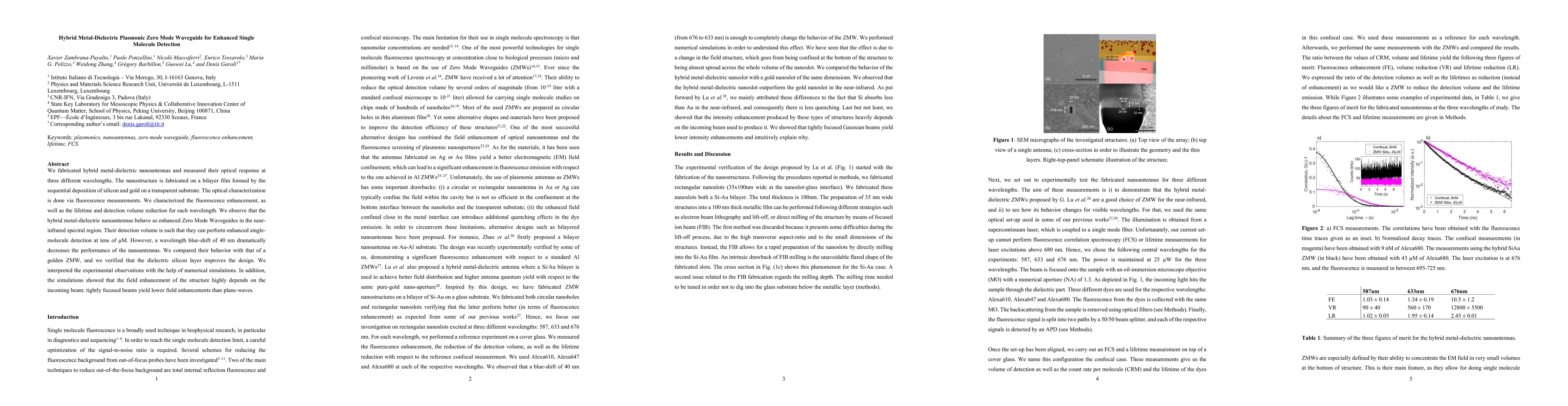 This paper reports on the fabrication and optical characterization of hybrid metal-dielectric plasmonic nanoantennas functioning as Zero Mode Waveguides for enhanced single-molecule detection, with improved performance over golden ZMWs, but performance degrades with a 40 nm wavelength blue-shift. Numerical simulations corroborate experimental results and suggest field enhancement depends on the incoming beam type.