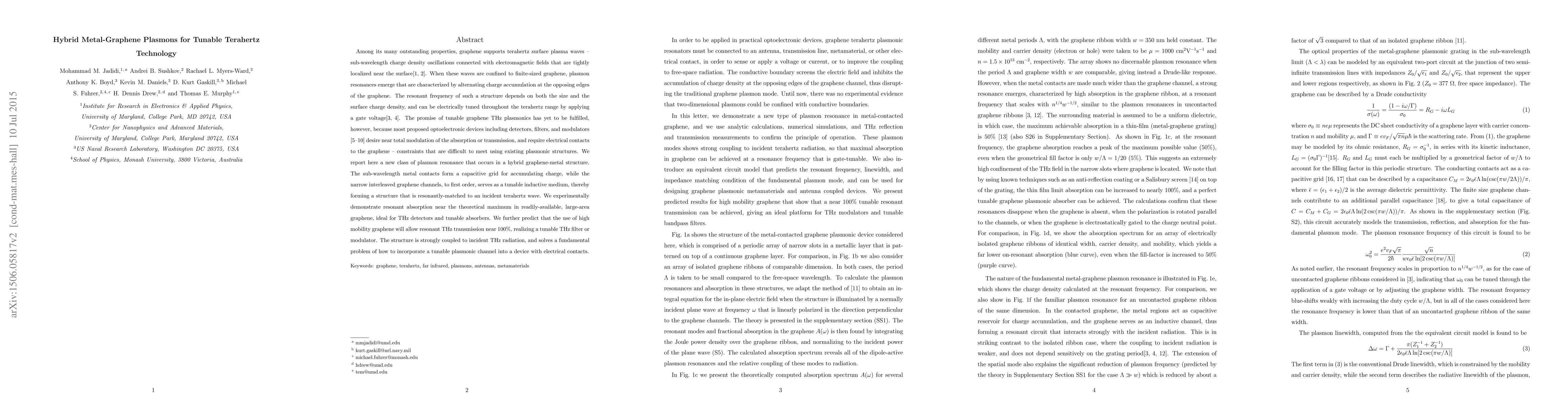 This paper introduces hybrid metal-graphene plasmons for tunable terahertz technology, demonstrating resonant absorption and transmission near the theoretical maximum in large-area graphene, and proposing a capacitive-inductive hybrid structure that addresses the challenges of existing tunable plasmonic devices.