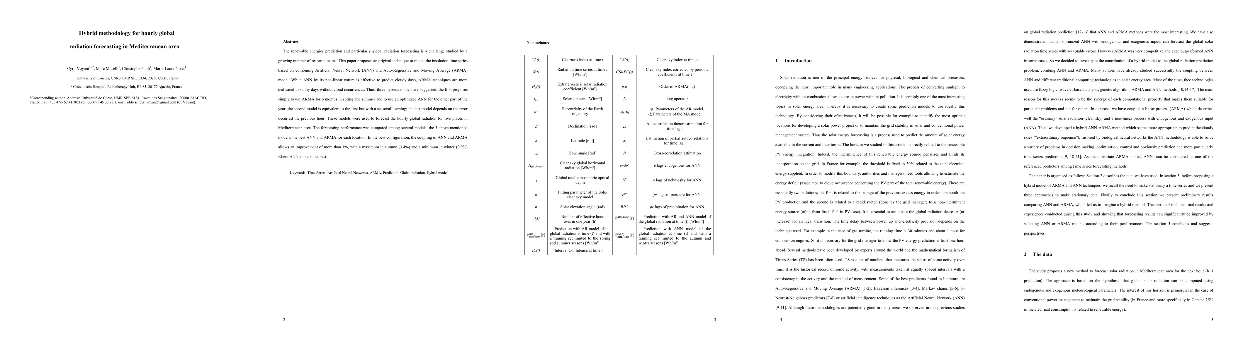 This paper proposes a hybrid methodology combining Artificial Neural Networks (ANN) and Auto-Regressive and Moving Average (ARMA) models to forecast hourly global radiation in the Mediterranean area. The hybrid approach optimizes predictions for different weather conditions, achieving up to 3.4% improvement in autumn compared to standalone models.