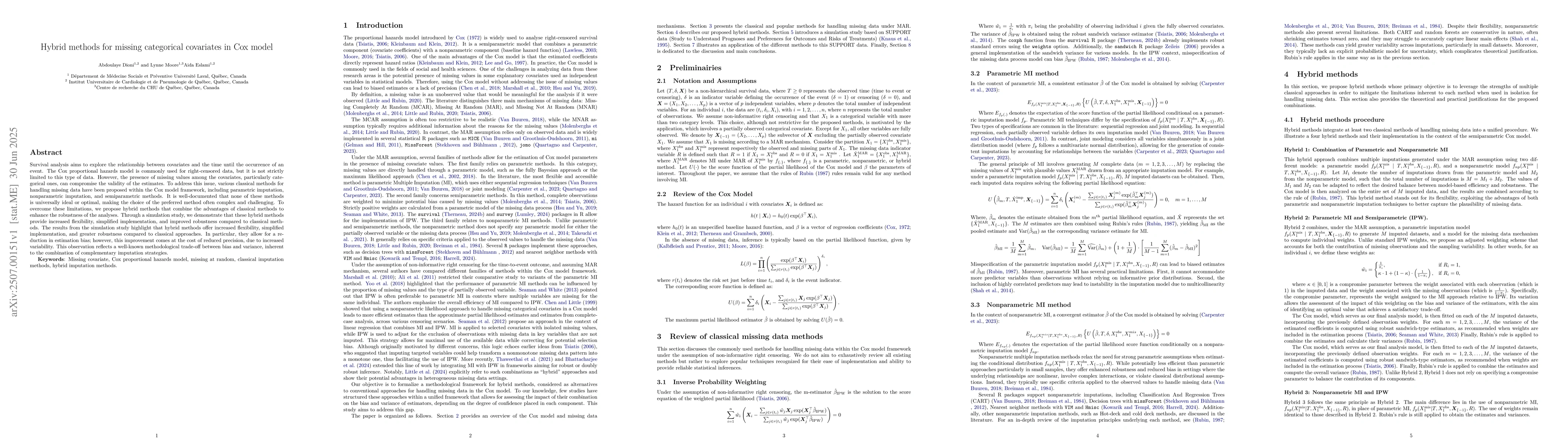 Survival analysis aims to explore the relationship between covariates and the time until the occurrence of an event. The Cox proportional hazards model is commonly used for right-censored data, but it is not strictly limited to this type of data. However, the presence of missing values among the covariates, particularly categorical ones, can compromise the validity of the estimates. To address this issue, various classical methods for handling missing data have been proposed within the Cox model framework, including parametric imputation, nonparametric imputation, and semiparametric methods. It is well-documented that none of these methods is universally ideal or optimal, making the choice of the preferred method often complex and challenging. To overcome these limitations, we propose hybrid methods that combine the advantages of classical methods to enhance the robustness of the analyses. Through a simulation study, we demonstrate that these hybrid methods provide increased flexibility, simplified implementation, and improved robustness compared to classical methods. The results from the simulation study highlight that hybrid methods offer increased flexibility, simplified implementation, and greater robustness compared to classical approaches. In particular, they allow for a reduction in estimation bias; however, this improvement comes at the cost of reduced precision, due to increased variability. This observation reflects a well-known methodological trade-off between bias and variance, inherent to the combination of complementary imputation strategies.