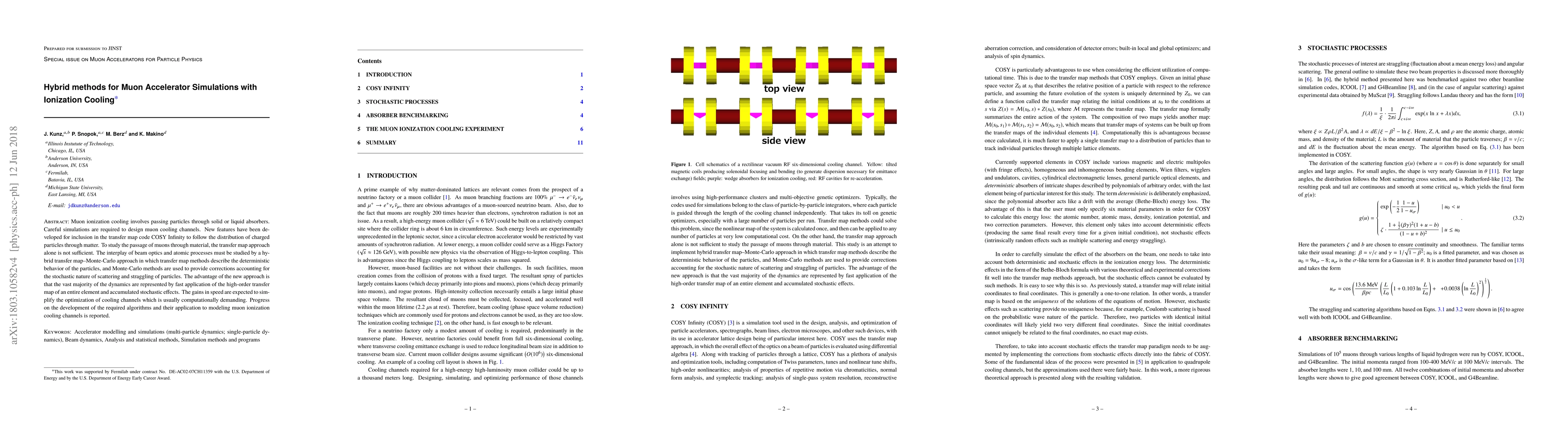 Muon ionization cooling involves passing particles through solid or liquid absorbers. Careful simulations are required to design muon cooling channels. New features have been developed for inclusion in the transfer map code COSY Infinity to follow the distribution of charged particles through matter. To study the passage of muons through material, the transfer map approach alone is not sufficient. The interplay of beam optics and atomic processes must be studied by a hybrid transfer map--Monte-Carlo approach in which transfer map methods describe the deterministic behavior of the particles, and Monte-Carlo methods are used to provide corrections accounting for the stochastic nature of scattering and straggling of particles. The advantage of the new approach is that the vast majority of the dynamics are represented by fast application of the high-order transfer map of an entire element and accumulated stochastic effects. The gains in speed are expected to simplify the optimization of cooling channels which is usually computationally demanding. Progress on the development of the required algorithms and their application to modeling muon ionization cooling channels is reported.