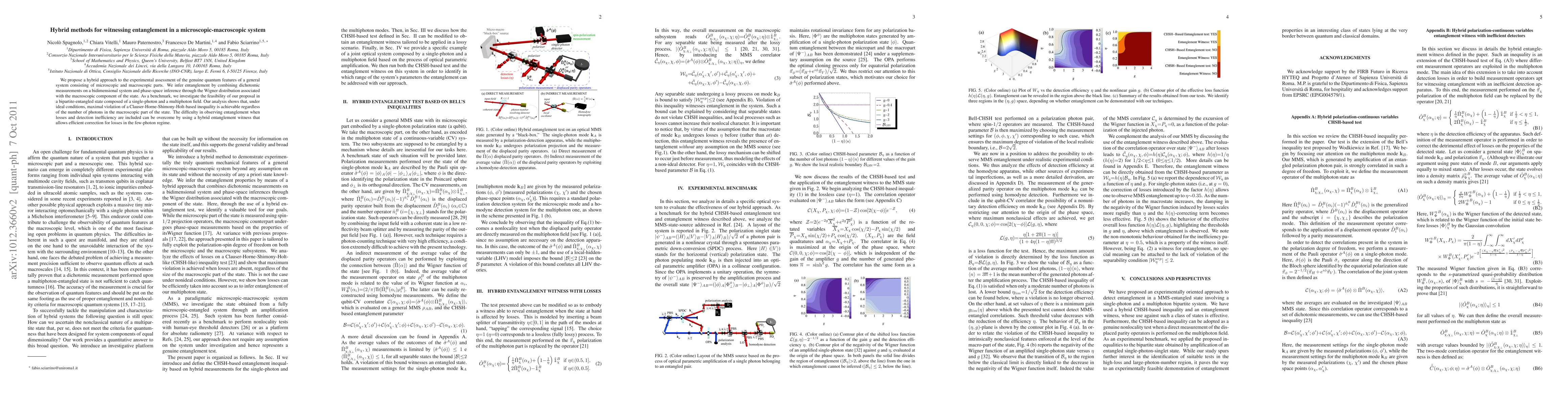 We propose a hybrid approach to the experimental assessment of the genuine quantum features of a general system consisting of microscopic and macroscopic parts. We infer entanglement by combining dichotomic measurements on a bidimensional system and phase-space inference through the Wigner distribution associated with the macroscopic component of the state. As a benchmark, we investigate the feasibility of our proposal in a bipartite-entangled state composed of a single-photon and a multiphoton field. Our analysis shows that, under ideal conditions, maximal violation of a Clauser-Horne-Shimony-Holt-based inequality is achievable regardless of the number of photons in the macroscopic part of the state. The difficulty in observing entanglement when losses and detection inefficiency are included can be overcome by using a hybrid entanglement witness that allows efficient correction for losses in the few-photon regime.