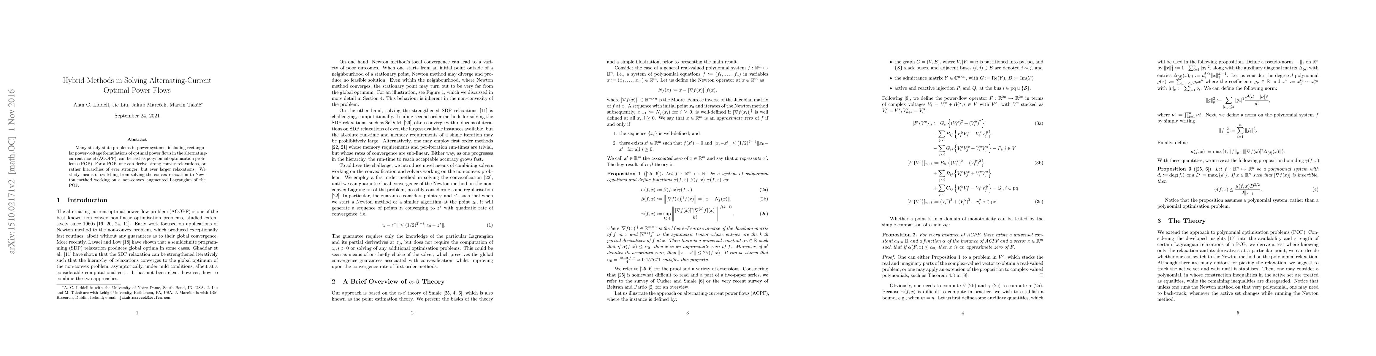 This paper explores hybrid methods for solving alternating-current optimal power flow (ACOPF) problems by combining convex relaxations with Newton's method on non-convex Lagrangians. The focus is on transitioning from convex relaxations to more efficient non-convex optimization techniques.