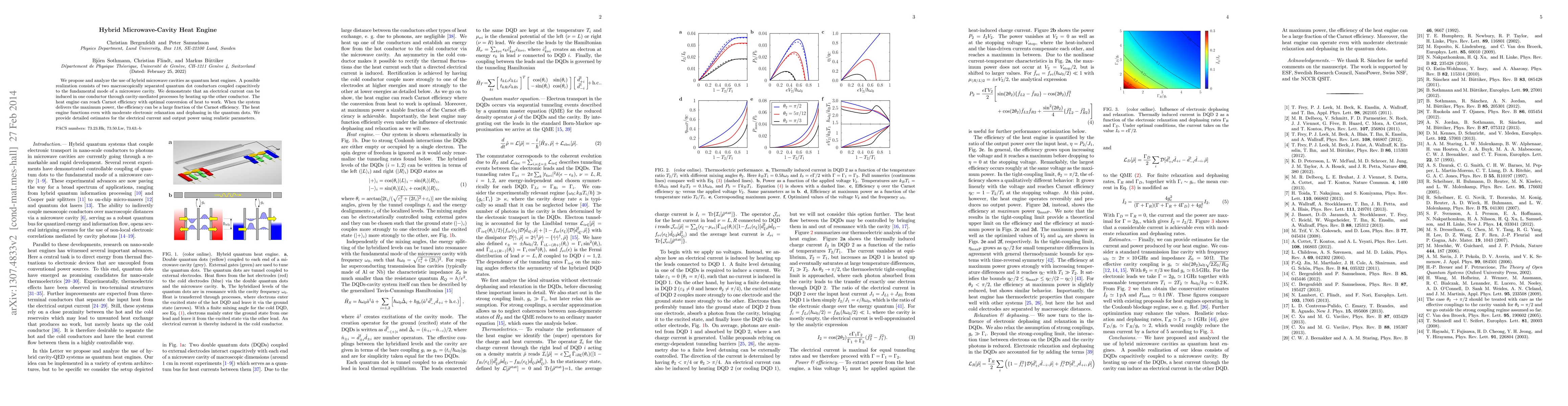 This paper proposes a hybrid microwave-cavity heat engine using two quantum dot conductors coupled to a microwave cavity, demonstrating the potential for high efficiency and substantial electrical current generation, even under moderate electronic relaxation conditions. The system can achieve near-Carnot efficiency and significant output power.