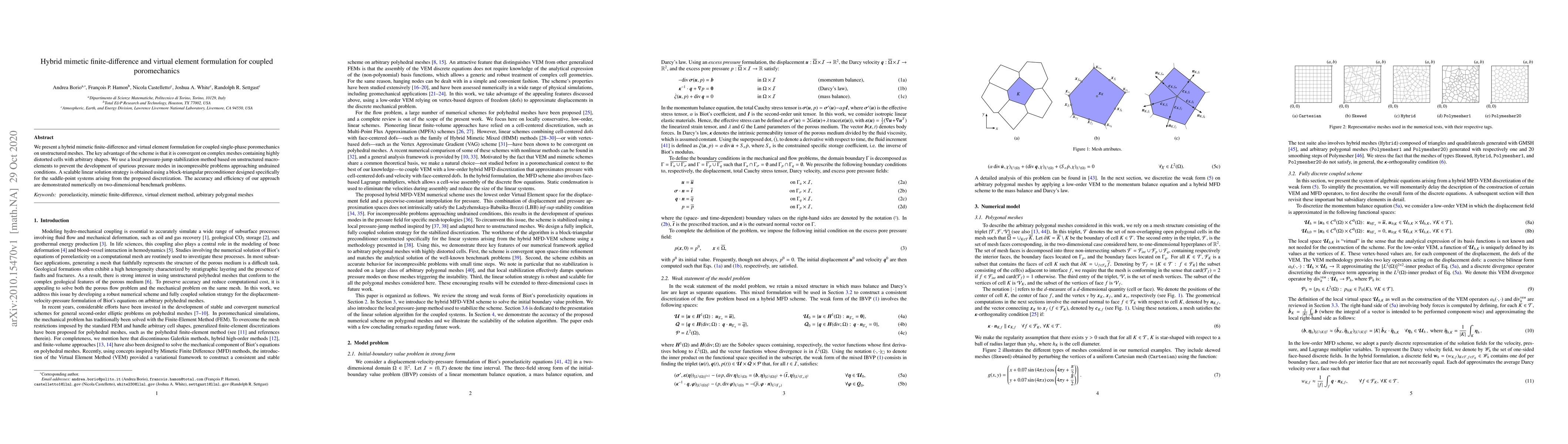 This paper introduces a hybrid mimetic finite-difference and virtual element method for coupled poromechanics on unstructured meshes, ensuring convergence on complex, distorted geometries. The method employs a local pressure-jump stabilization and a block-triangular preconditioner for efficient linear solutions.